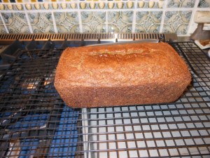 Pour batter into the prepared loaf pan (9×5). Bake on the middle rack of the oven for approx. 1 hour (you may need another 15 minutes depending on your oven). Remove cake, and with a cake tester, check for readiness (when the cake tester inserted into the center comes out clean.) I filled the loaf pan about 3/4 to the top. I had a little left over and was able to make 5 muffins with that leftover batter!