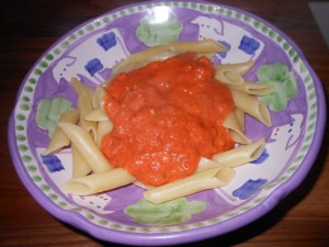 Once sauce is cooled down, I use the immersion blender stick and bring the sauce to a smooth consistency. If you don’t have the stick, use a blender and do it in batches. Once the sauce is smooth, reheat it and add heavy cream. Start slowly with the cream and mix until it gets to a creamy consistency. This will be between 3/4 to 1 cup. You can be the judge of how much cream to use. (There is a certain look to vodka sauce that you want to achieve. You know it!) Taste for salt, pepper and seasonings. Simmer for about 10 minutes. Serve over pasta with freshly grated parmesan cheese. I plated the pasta and put sauce on top individually so I could freeze the extra sauce without the pasta to use another time.