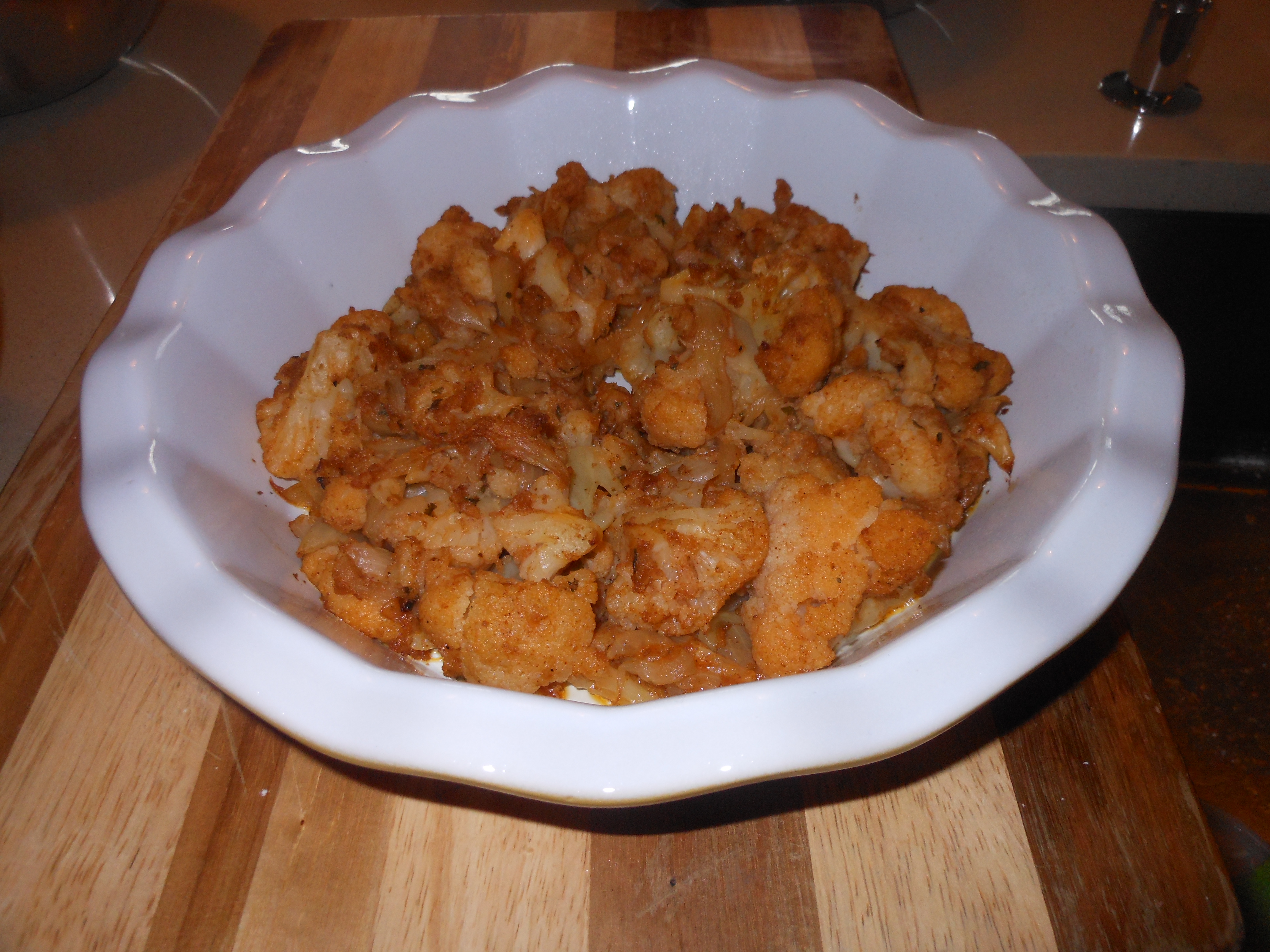 Slice onions and add to a large frying pan with the 1 cup of oil (heated). Add paprika, salt, pepper and garlic. Sauté onions until translucent and then let stand off the heat for about 15 minutes. Take frozen cauliflower out of boxes, put in microwave safe bowl, and microwave for 2 – 2 1/2 minutes, you want to get it defrosted and soft but not overly soft, should be firm, just to defrost and get all the water out of it. Drain and put cauliflower on paper towels. Trick is to get all water out, you want to start with cauliflower as dry as possible. That’s why frozen is easier to work with, you will be cooking it in the oven. Next, add Panko crumbs (when adding the crumbs start with 3/4 cup and if it looks like you need more add a bit, we used almost a full cup for the 4 boxes), mix well and then add the cauliflower. Bake for approx. 45 minutes, until heated through. (I place in one layer in a glass Pyrex until it gets very hot and a little crispy.) Taste for salt and pepper. Transfer to a serving dish.