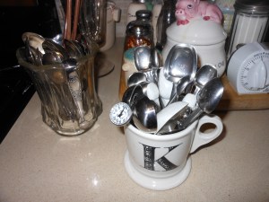I keep all of my measuring spoons on hand by my stove in this mug. You can never have enough of these spoons. Just a good idea: when you see spoons in the market, buy them and if you have nowhere to store them, this is such a good idea and always handy. I also keep a jar of spoons for tasting, because you can never have enough of these either.