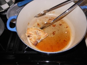 Pat the chicken breasts dry with paper towels and sprinkle generously with kosher salt and freshly ground black pepper on both sides. I used my Le Creuset cast iron pot, which is oven proof. You can use any oven proof skillet, preferably cast iron. Heat the oil over medium-high heat for a few minutes (just until oil starts to smoke.) Place the chicken breasts skin side down in the skillet and cook for approx. 5 minutes without moving (don’t play with them); you want a golden brown crust to form.