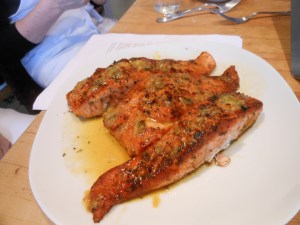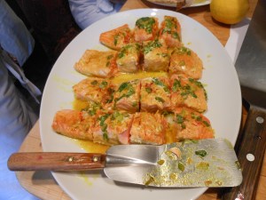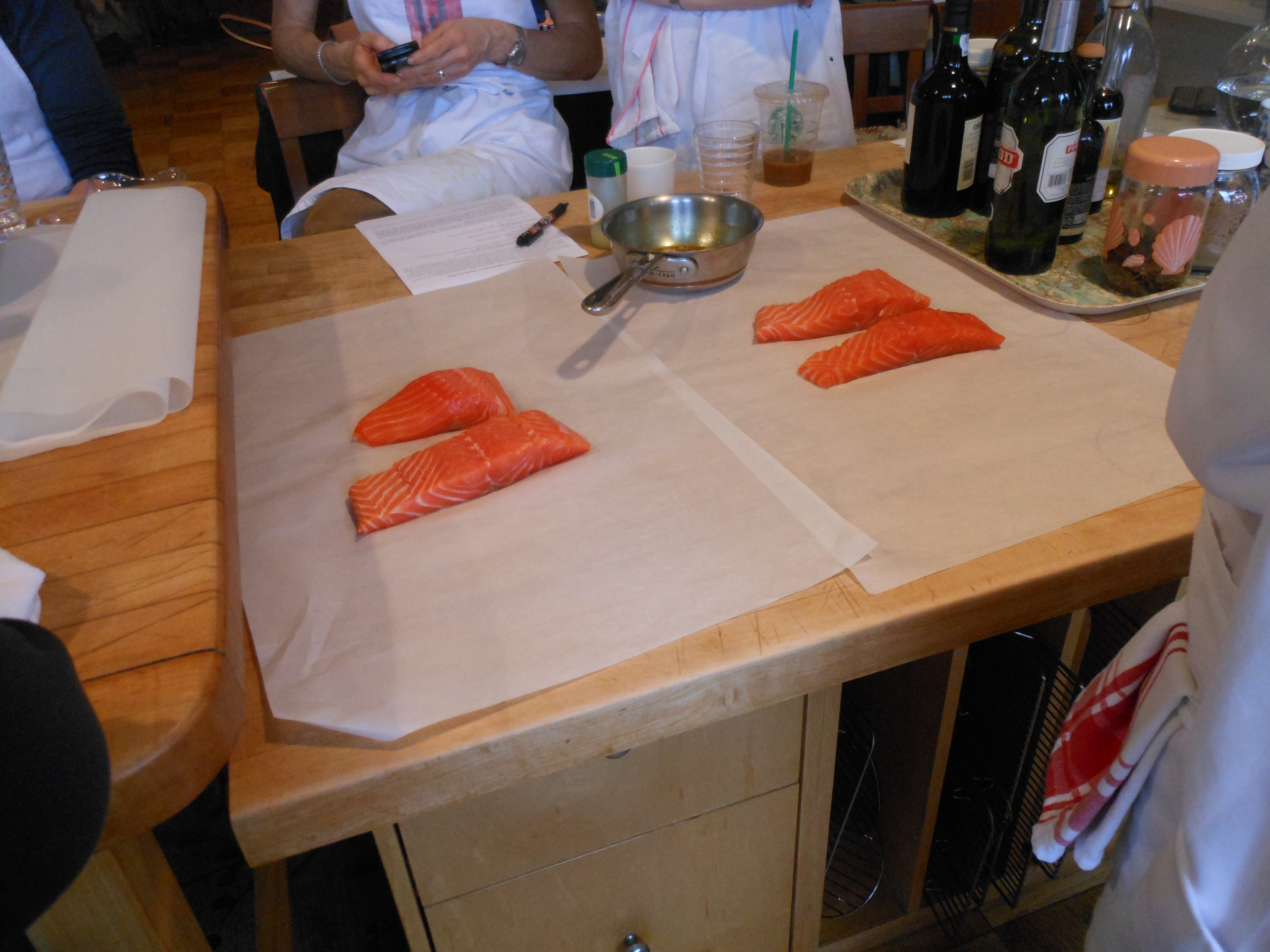 We are nearing the end of our stay in NY for the fall so I squeezed in one more cooking class with Karen Lee and I am so happy that I did. I had to be on the Upper West Side by 9 a.m. and left Roslyn only to sit in bumper to bumper traffic for 90 minutes to the midtown tunnel. So, I obviously didn’t arrive at the class until closer to 10. It was raining again and it’s such a good thing to do on a rainy day, but such a bad thing for the traffic situation. Once I walked in, any stress I had due to traffic left my body. It’s such a warm, “hamish” atmosphere, yet totally professional. Karen is a real dynamo, and very talented; she knows a lot about cooking, products, and food in general. If the opportunity ever arises, I highly recommend her classes. We cooked from 10 – 2:30 and ate our way through the morning into the afternoon. When I looked at the clock at 1:40, I didn’t know where the time went but it was well spent for sure. We made 3 kinds of salmon, 2 beautiful salads, and a poached pear dessert. (I will elaborate on the recipes.) I learned a few new techniques, a few new facts, and made a few new friends. What a great day!