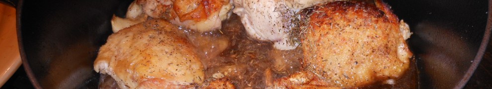 Dry the chicken with paper towels. Season liberally with kosher salt and freshly ground black pepper. Heat the butter and oil in a large dutch oven pot (once again, Le Creuset is perfect.) Cook over medium high heat, but don’t let olive oil start smoking, you’ll want it hot enough to form a nice crust on chicken. In batches, saute the chicken in the olive oil/butter, skin side down (and don’t touch it) for about 5 minutes on each side. Turn with tongs or spatula, because a fork can pierce the skin. If the oil is smoking too much and burning chicken, turn down the heat. When each batch is done, transfer to a plate and continue to saute the rest of the chicken. Remove all the chicken to plate. Now add all of the garlic back to the pot on a lower heat. Saute for about 5 to 10 minutes, until garlic browns, but not burns, up. Scrape up any brown bits as you go. Add 2 tablespoons of cognac and the wine, return to a slow boil, and scrape up bottom of pan (de-glaze). Return the chicken to the pot with the juices and sprinkle with the thyme. Cover and simmer over the lowest heat for about 30 minutes, until the chicken is cooked through. After the chicken is cooked through, remove the chicken to a plate and cover with aluminum foil to keep it warm. Remove 1/2 cup of the cooking liquid and in a small bowl, whisk together 1 tablespoon of flour and then put into pot with the rest of the sauce. If it is still not thick enough, add a little more flour. I find that 2 tablespoons is too much flour–but you may need to add more to reach the appropriate thickness. Raise the heat, add the remaining tablespoon of cognac and the cream, and boil for 3 – 5 minutes. Taste for salt and pepper. I didn’t need any more because my chicken was sufficiently seasoned already. Plate the chicken, pour the sauce on top, add a few pieces of garlic and serve hot over orzo or rice. A salad or vegetable is also perfect.