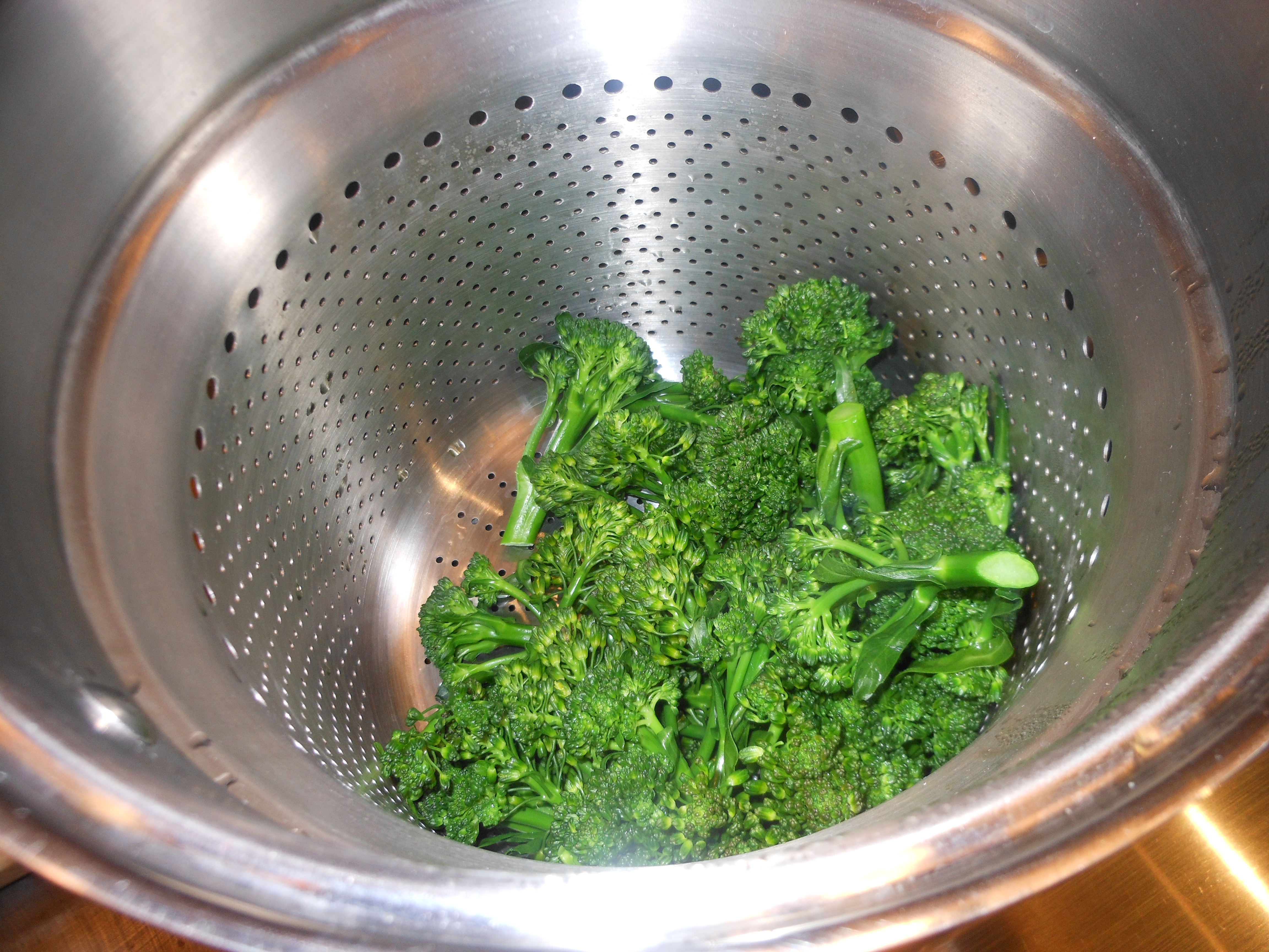 Bring a large pot of salted water to a boil. I use the pasta insert for the broccoli (just easier). If you don’t have that, just add the broccoli and cook until crisp-tender, approx. 3 minutes. Remove broccoli with a slotted spoon and transfer to a bowl. Leave water, return to a boil and use for pasta. After pasta is cooked, drain it and reserve 1/2 cup of the water.