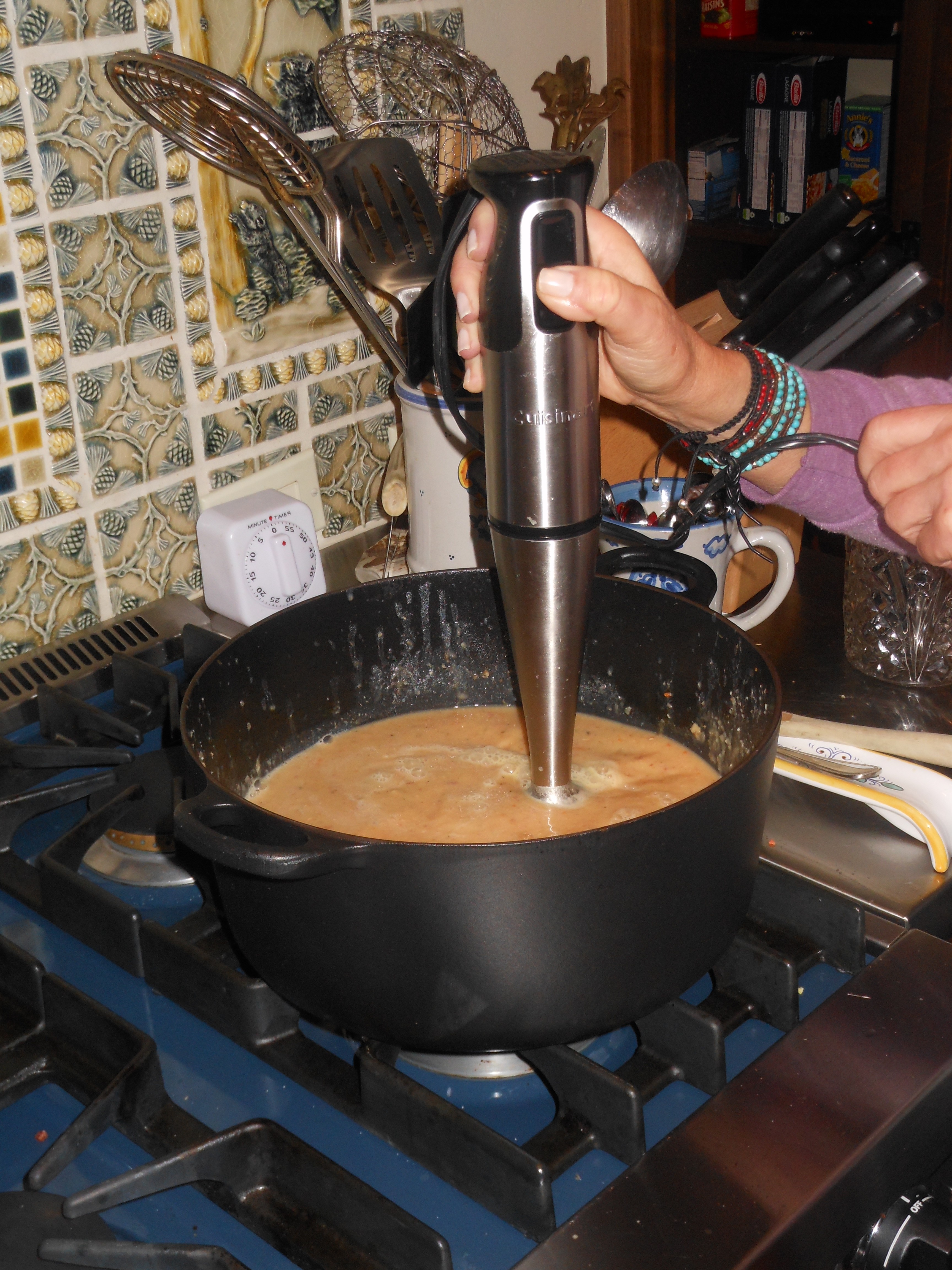 Beautiful, hearty, soup–rustic in flavor and perfect to take the chill out of a winter day or night. I love soup as a meal. Just mix with salad and crusty bread and you’re good to go; it’s so satisfying. If you’re looking for a vegetarian meal, take out pancetta. If you don’t care, leave it in because it adds a real bite to the soup. Of course, by now you have an immersion blender but if you still haven’t gotten one, you’ll use the blender.