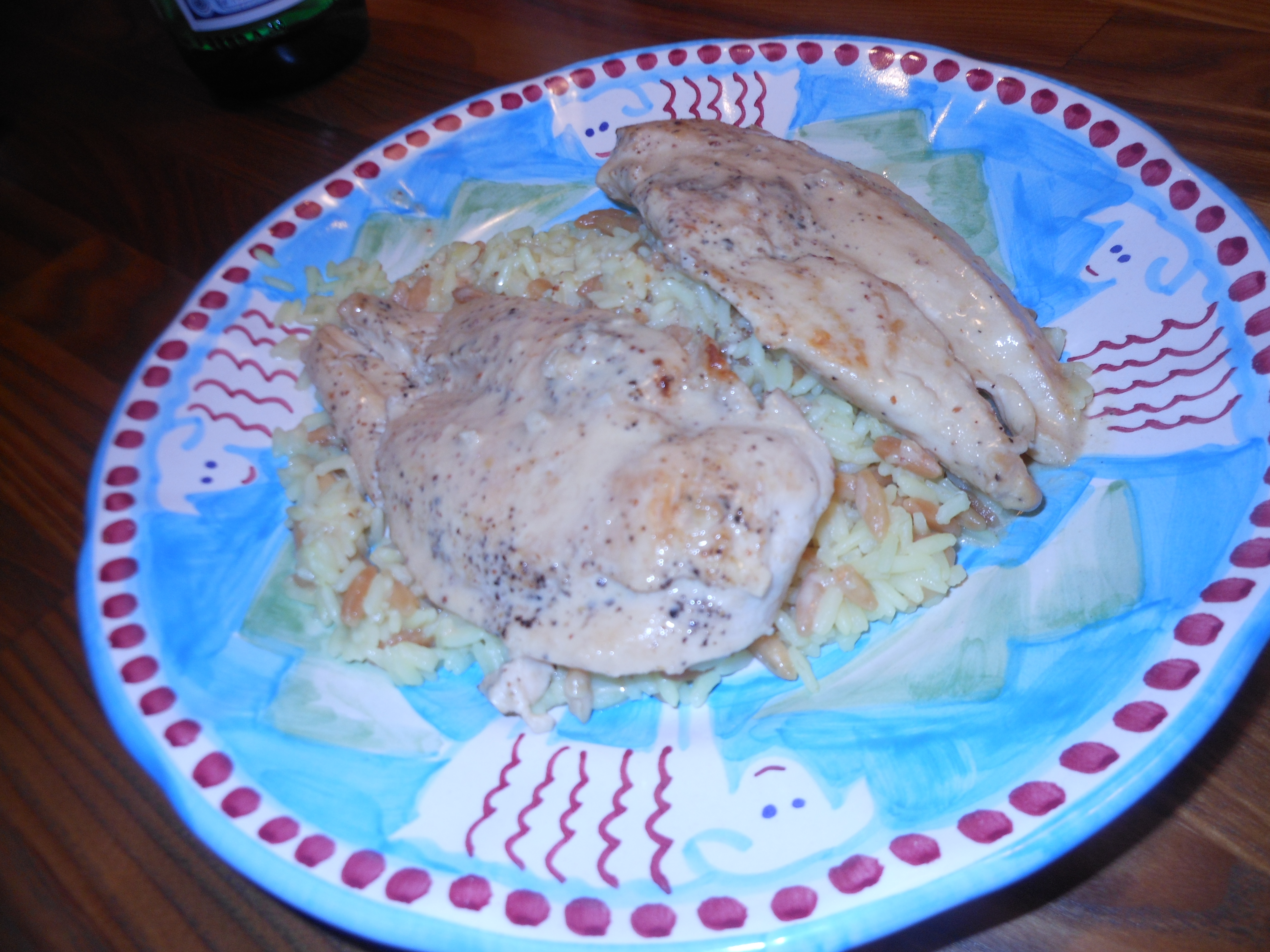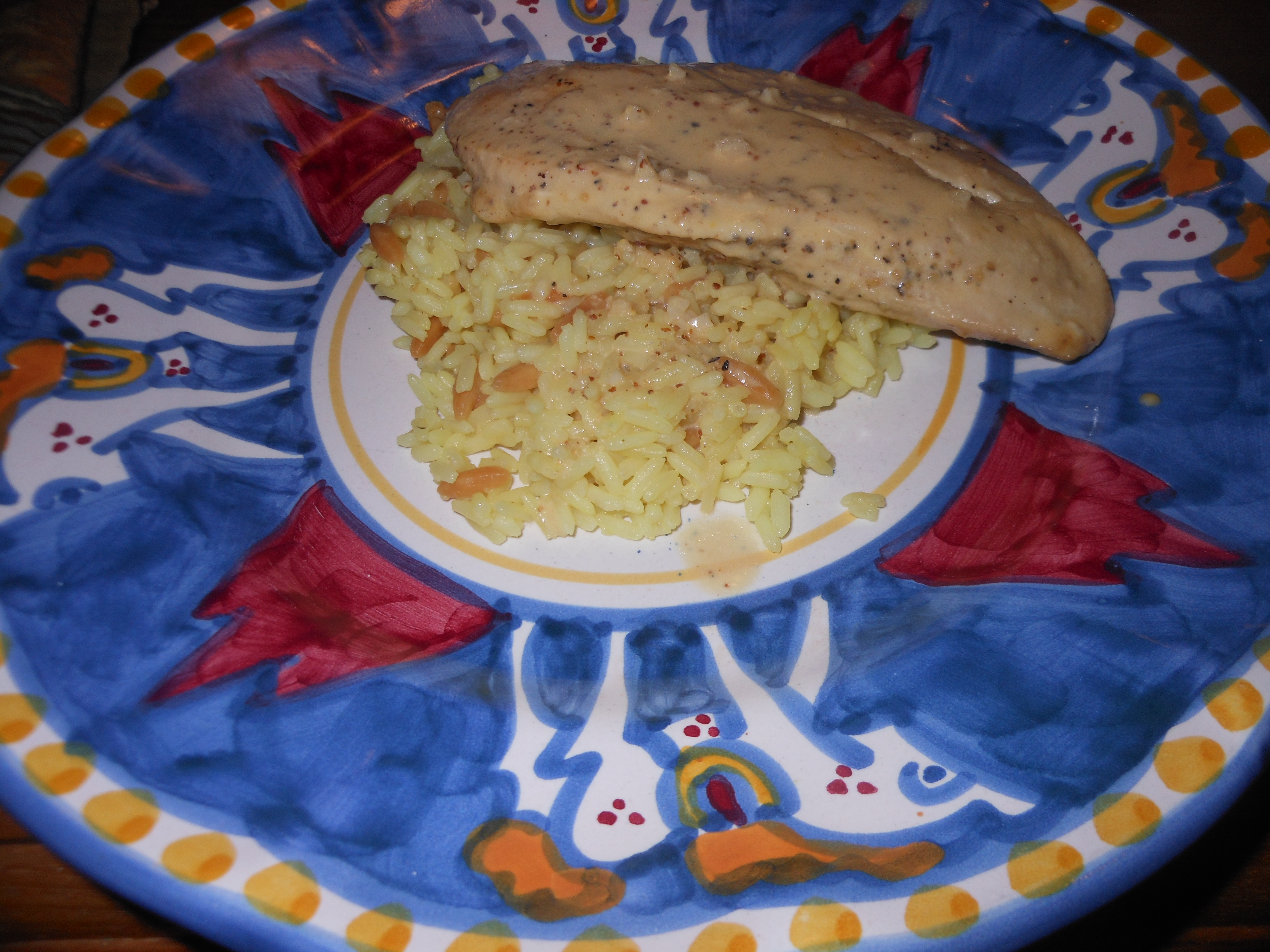 This was our dinner this evening. It was easy to prepare and quick to cook. Yes, it has cream in it, but once in a while it’s OK I figure. (If you really are opposed to the cream, then perhaps this recipe isn’t for you. But if you love mustard, chicken and everything else in here, then go for it.) I cooked about 1 1/2 lbs. of chicken breasts; they’re the thin ones. This was enough for 3 people. There were 5 thin breasts in the package and actually more mustard sauce than we needed. For more people, just double the chicken and squeeze as much as you can into the pan, or just do chicken in batches. I served this over rice pilaf with a green salad. Thanks to The Pioneer Woman for this recipe.