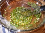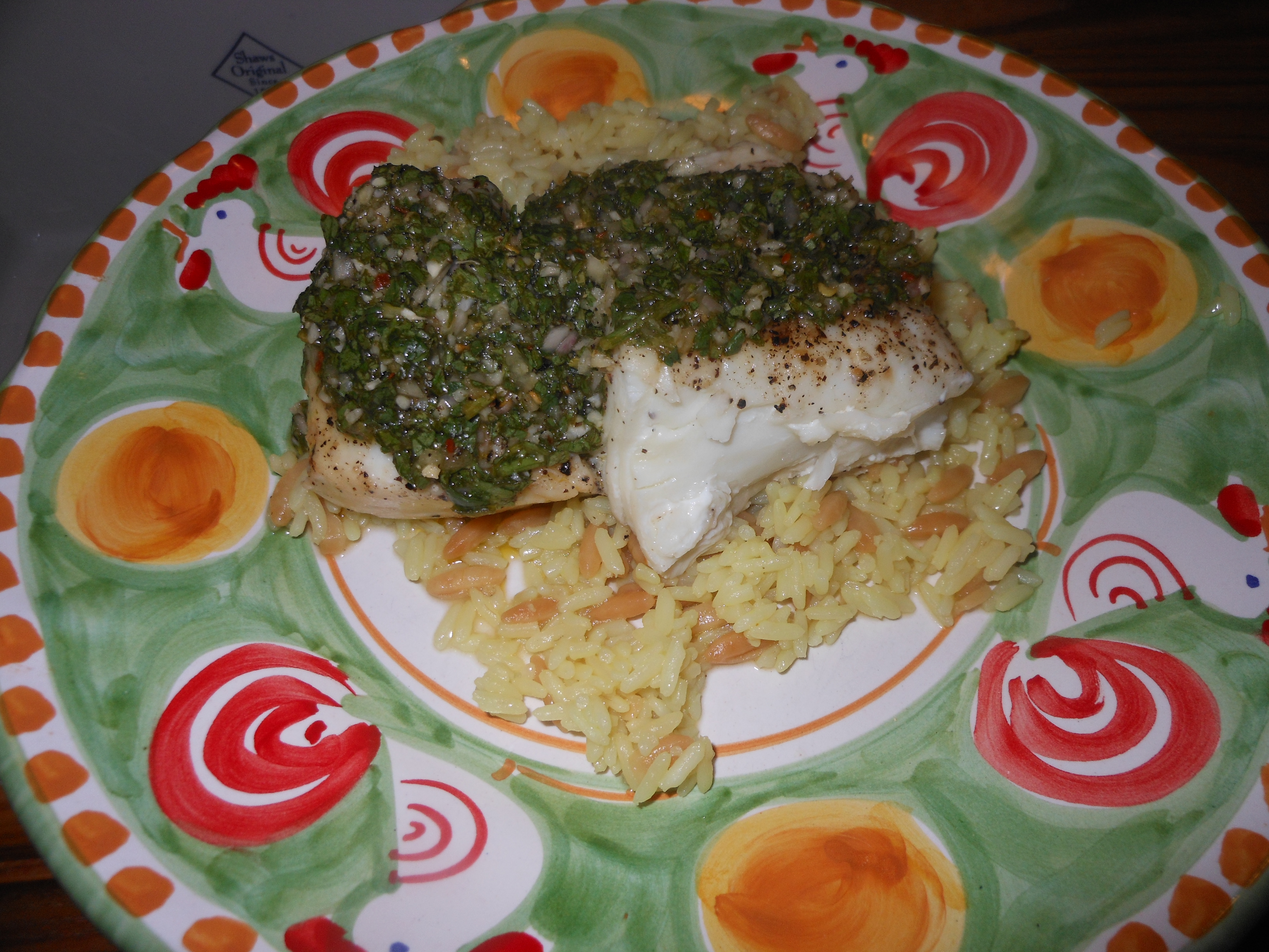 Joel always asks me to cook halibut, now you have to understand that he doesn’t really like fish, so this request is a bit odd right from the start. He says he likes halibut and I usually make salmon. He loves shrimp but that doesn’t count, I know he’s an ex-seafood guy but shrimp was really his thing not fish. So today I decided to honor his request and make halibut. It has never really appealed to me , it seems like such a bland white fish. I really spiced it up with this chimichurri , it was delicious. Chimichurri sounds so intimidating but it is just a green marinade. It is  usually made up of chopped fresh parsley, garlic, pepper and herbs bound with oil. I however decided to make it with cilantro not parsley. Obviously if you like cilantro do it this way, if not just use parsley. It was pretty easy and very tasty. I served it over rice pilaf and we had a side of tomatoes with balsamic syrup. You can also moderate the use of the crushed red pepper, since we like it spicy I used 3/4 teaspoon of the pepper, but use less or omit it all together. This was really pretty awesome if I do say so myself.