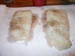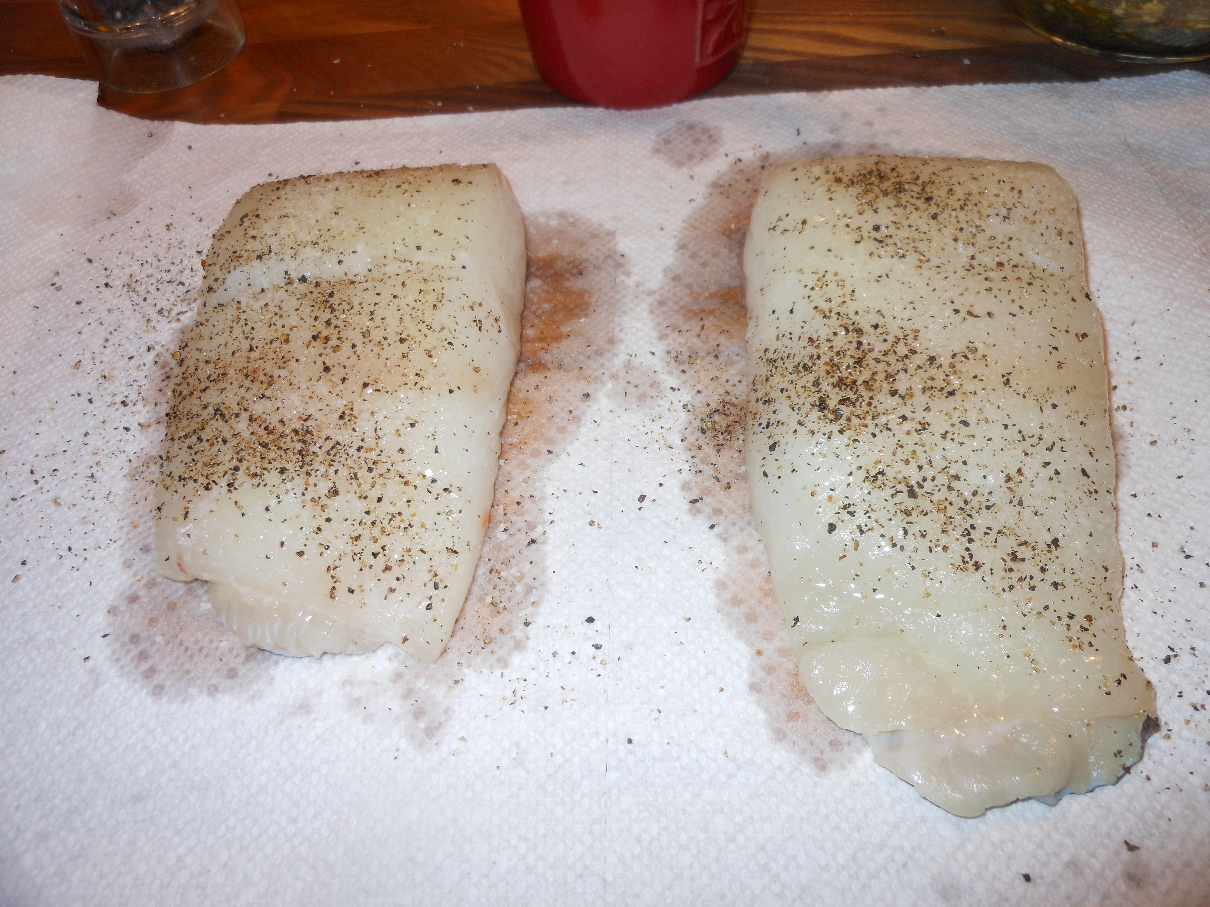 Pat fish dry with some paper towels, brush the vegetable oil on the fish ( skin side down) and sprinkle with kosher salt and freshly ground black pepper.