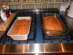 Bake in 2 standard loaf pans, sprayed well with nonstick spray I used Pam Baking Spray. Cook for about an hour, check after 50 minutes, use a cake tester till it comes clean. My breads took 55 minutes.