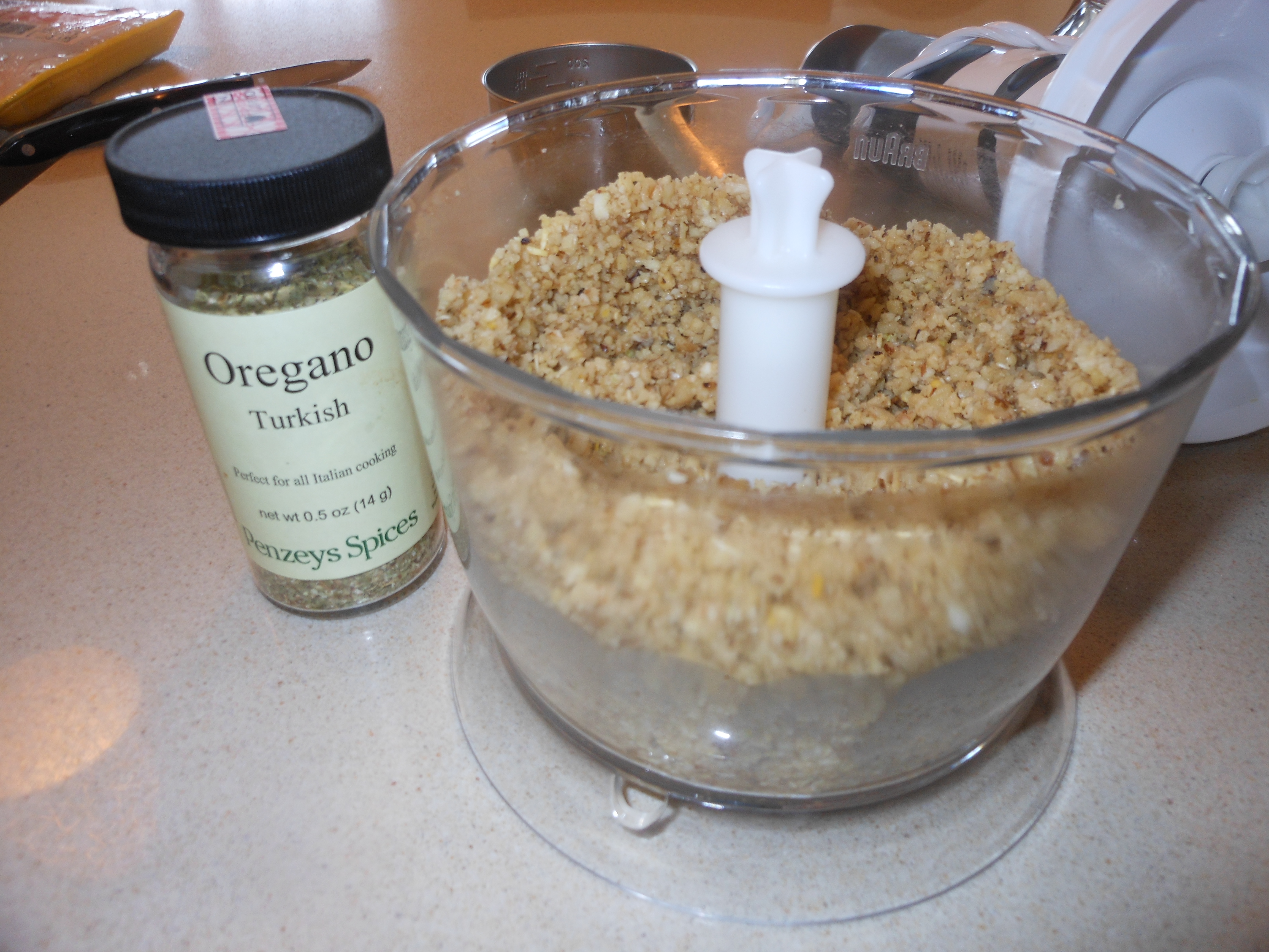 Place the walnuts, pine nuts and garlic in a food processor and pulse to a fine chop. Add the oregano and pulse a few more times until combined together.