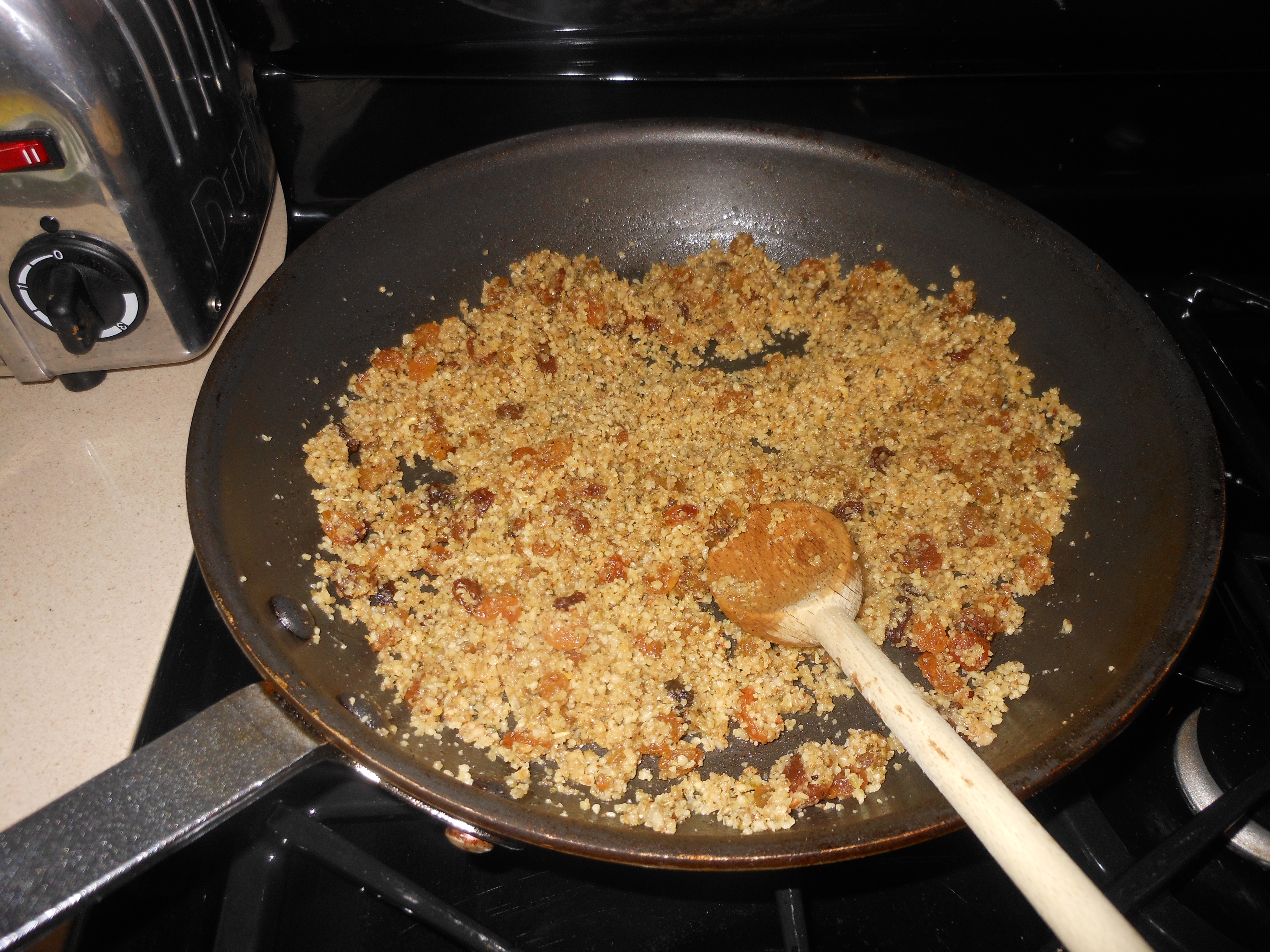 Heat the olive oil in a medium-sized skillet over medium heat, add the nut mixture, along with the raisins, and salt and pepper to taste (you will need a fair amount). Cook for about 5 minutes, being sure not to burn. Set aside.