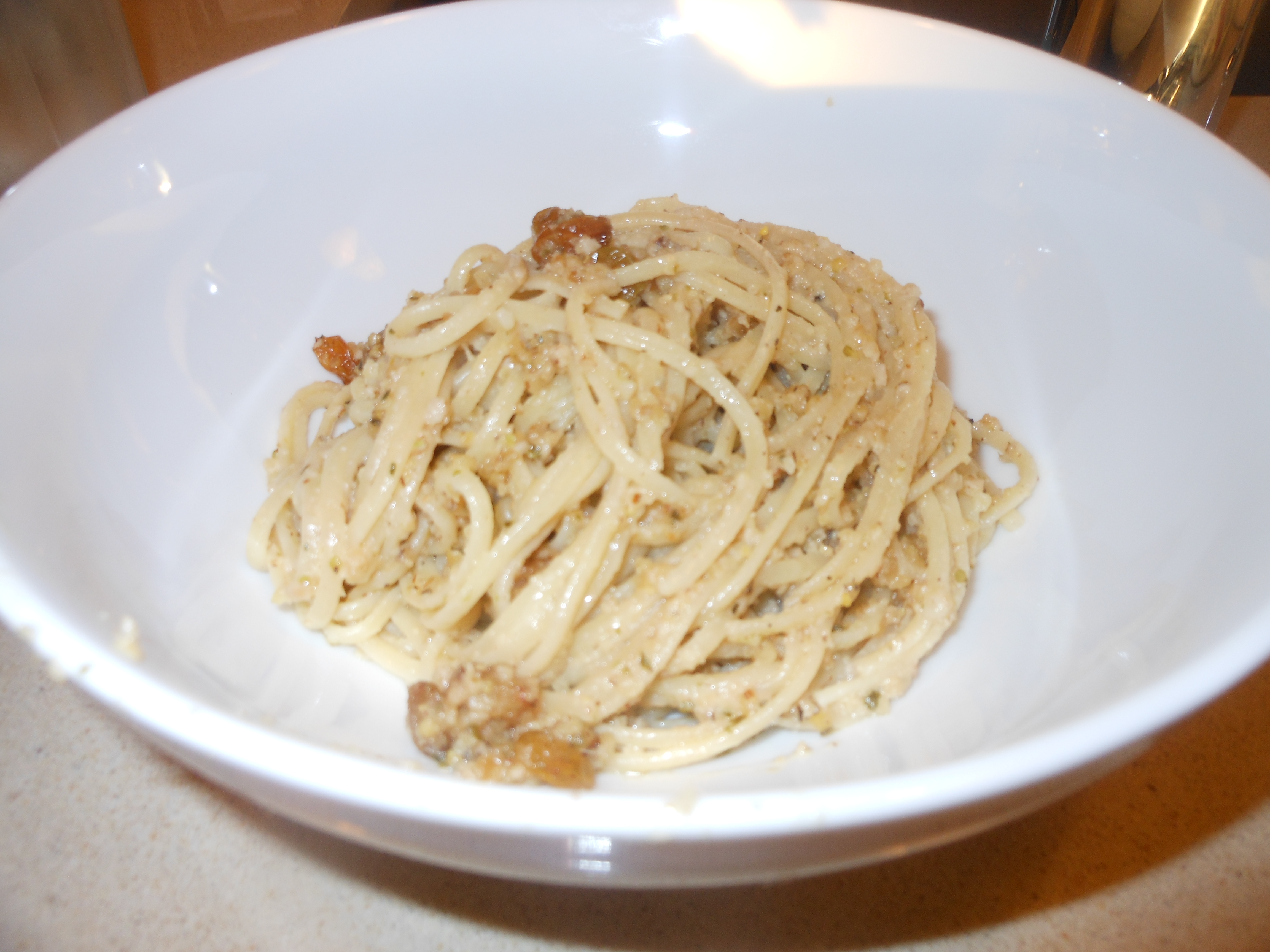 This pasta dish is a sweet, salty, nutty, think out of the box kind of pasta.  I made it alongside chicken for dinner and it is a most delicious side dish which is completely vegetarian and if you leave out the parmesan it can also be completely vegan. It is perfect as a main vegetarian dish, too. Did it all in the food processor, cooked the pasta and tossed the nuts in some olive oil with raisins. The nuts have a lot of substance and add a lot of flavor to the spaghetti. Something a little different  and a rather adventurous pasta for sure. This recipe could probably yield enough for 2 boxes of pasta depending on how much sauce you like. I made 3/4 of a pound of pasta and didn’t use all the Foriana sauce. Original recipe is from Food52 Blog.  It can also be made with anchovies if you’re so inclined. (I would add about 5 and chop them up but I left them out this time.) If you are going to keep nut mixture in fridge without pasta I would put a thin layer of olive oil over it. It would keep like this in refrigerator for at least a week. When you’re ready to use it, bring it to room temperature, and heat it up well. You may need to add a little more olive oil to the pasta later; you’ll have to check the consistency. Think Nut Pesto.