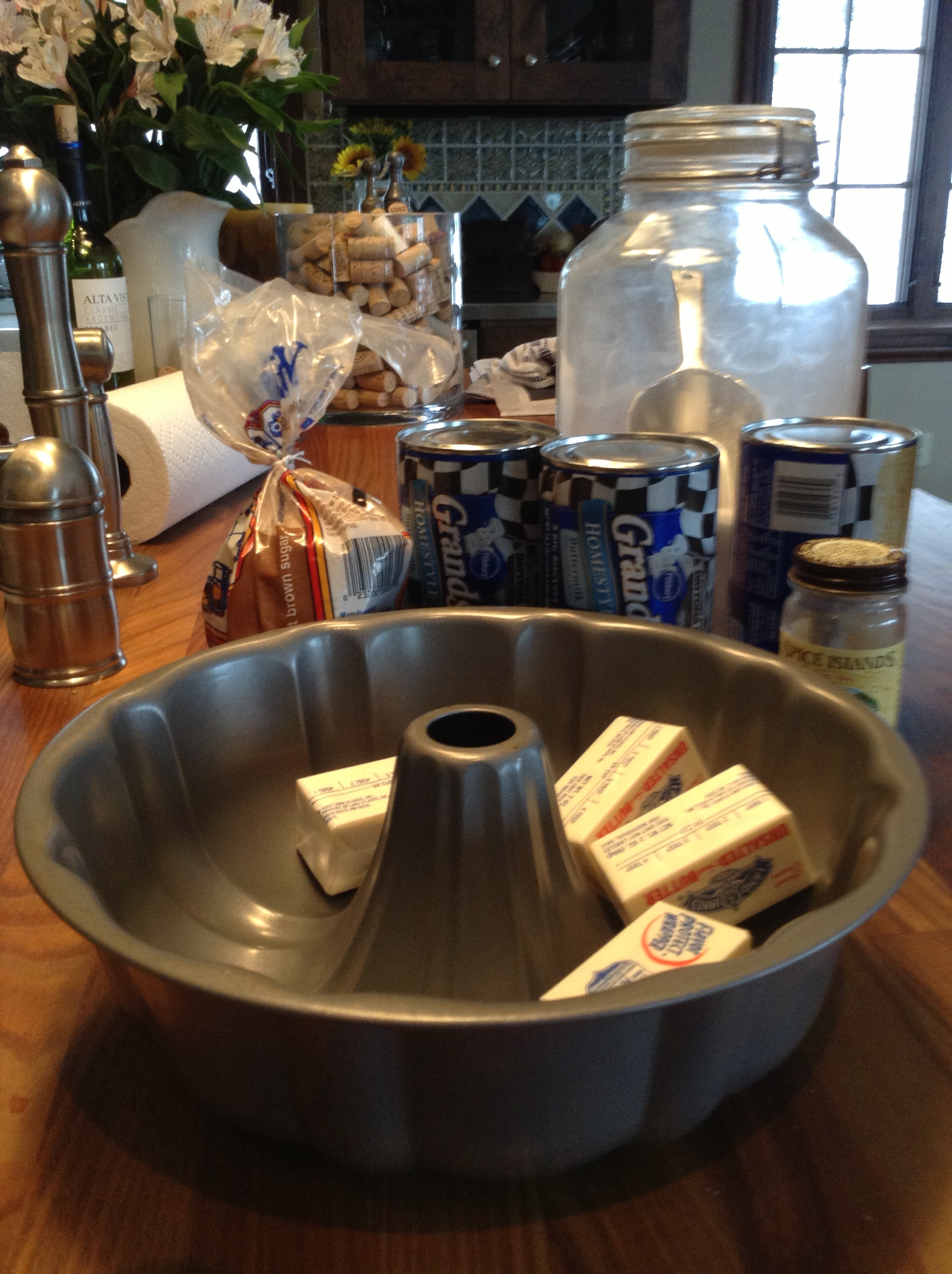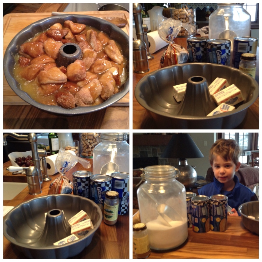 photo (2)photo (3)photoMy grandson Brody and I were in the house and I wanted to do something in the kitchen which would engage him and give us both something to do together. This is a perfect cooking exercise to do with young kids, they enjoy making it and eating it. He is only 3 but he enjoyed doing the whole thing as much as I did. This is a super-gooey sticky buns type of cake, not sure about where the Monkey title comes from, but it is like a bunch of cinnamon munchkins melded together with delicious caramelized goo. If you’re into this , it’s awesome. Superbly caloric and probably the last thing in life any of us needs to eat, but super delish. Joel loved it as you can well imagine, as did my daughter, her husband and myself. No one is advocating eating this on a daily basis but every blue moon it’s wonderful. Fun for kids and great for a crowd, everyone can pull off a piece. It’s hard to stop pulling at it.  You’ll want to let it cool down for about 30 minutes before you flip it over. I would use as deep a bundt as you have and not use a 2 piece tube because I would worry it would leak. Don’t fill it up to top with raw dough, only about 2/3 full because it does grow in the oven, and that would be a disaster in your oven if this overflowed. I also sprayed ( Pam) bundt pan well, and placed on a sprayed  cookie sheet in oven just in case. I needed to cook it for about 60 minutes, you’ll want the top of it browned. If you eat it when it’s fresh it’s beyond delicious, just try to resist eating it when it’s too hot. The next day just microwave for 15 seconds and you’ll restore the goodness.