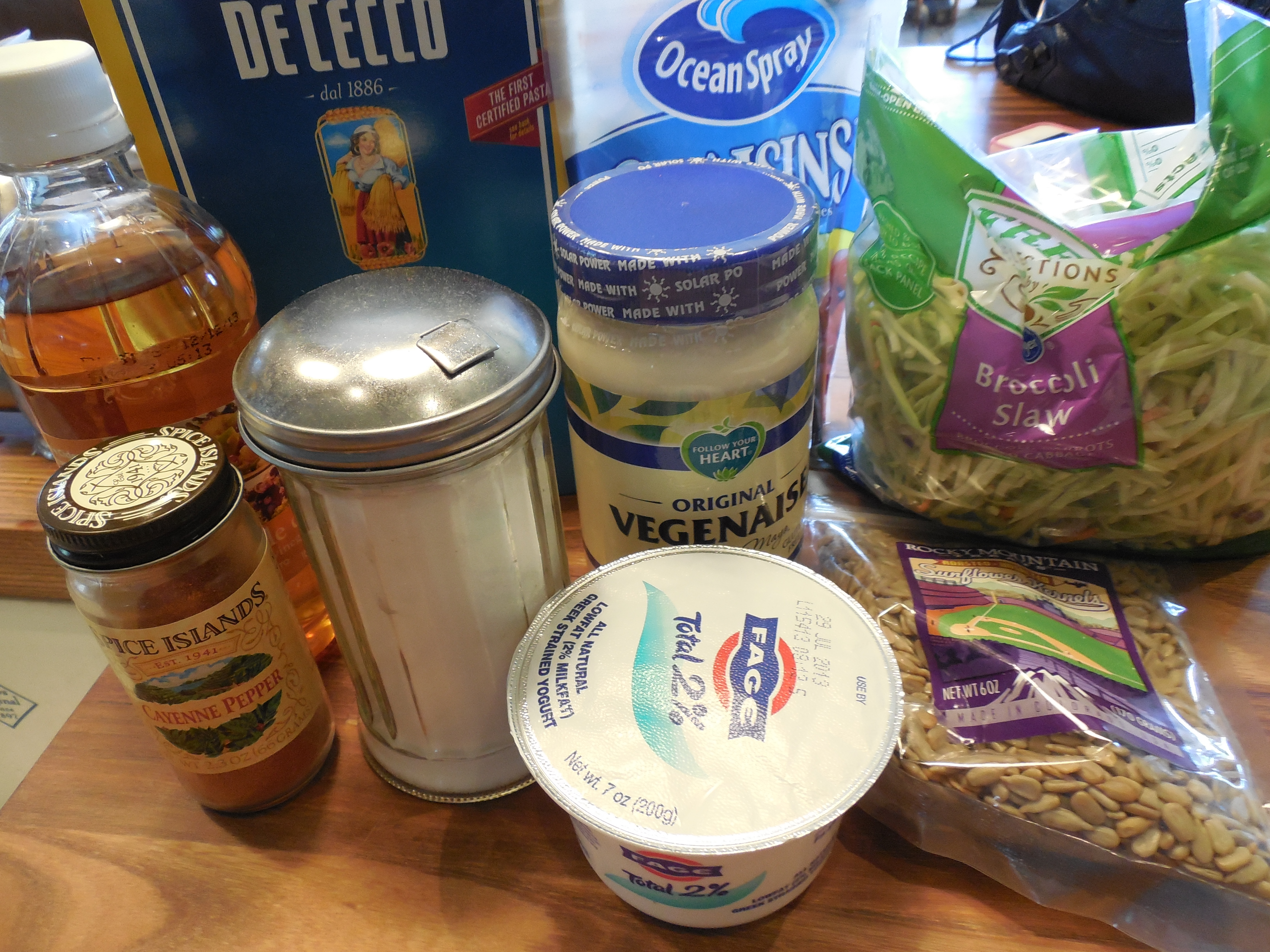 My new obsession seems to be this broccoli slaw. It is so easy to use, has a lot of crunch and tastes delicious in different ways with different dressings. This one is super easy to put together, and I used Vegenaise but you can clearly use Mayonnaise if you don’t care , either or. Ingredients are easy to obtain in almost any supermarket today. I used 1/4 teaspoon of cayenne and it had a bit of kick, if you don’t like the kick take it down a notch or omit it entirely and it will be just fine. This is a great raw summer slaw/pasta salad packing nutrients, crunch and sugar and spice. I used about 6 oz. of farfalle ( bowtie pasta) and again you could probably make this and leave out the pasta entirely if that’s the way you’d like it. I would then double the slaw. I bought the broccoli slaw in a 12oz. bag.