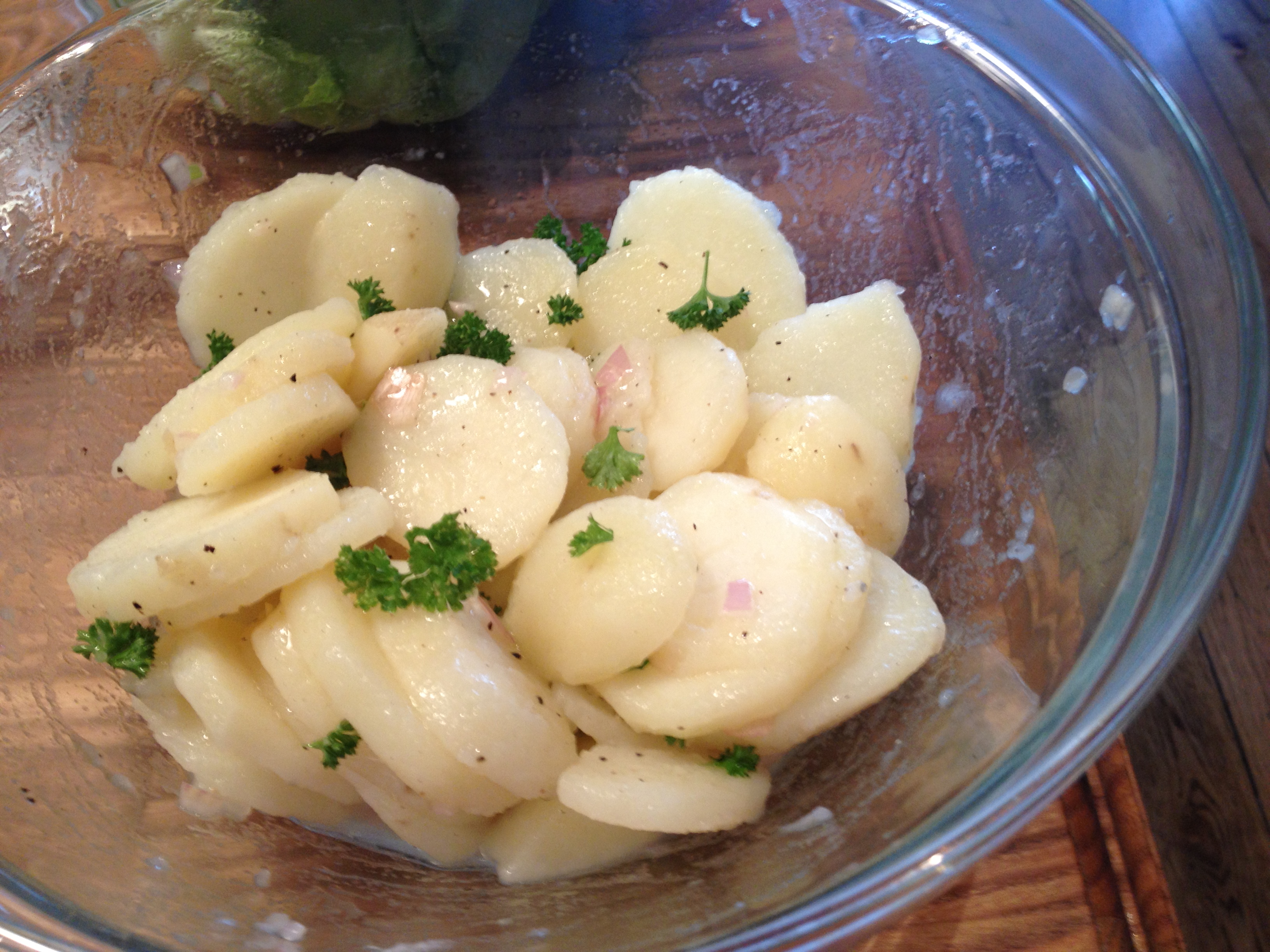 Get a nice roomy bowl and toss gently with the shallots, add the stock, vinegar and parsley. Let sit for app. 10 minutes or so, tossing gently a few times. Then correct salt and pepper seasoning, toss with the olive oil. I let the potatoes sit for about 1/2 hour to absorb the flavors at room temperature.
