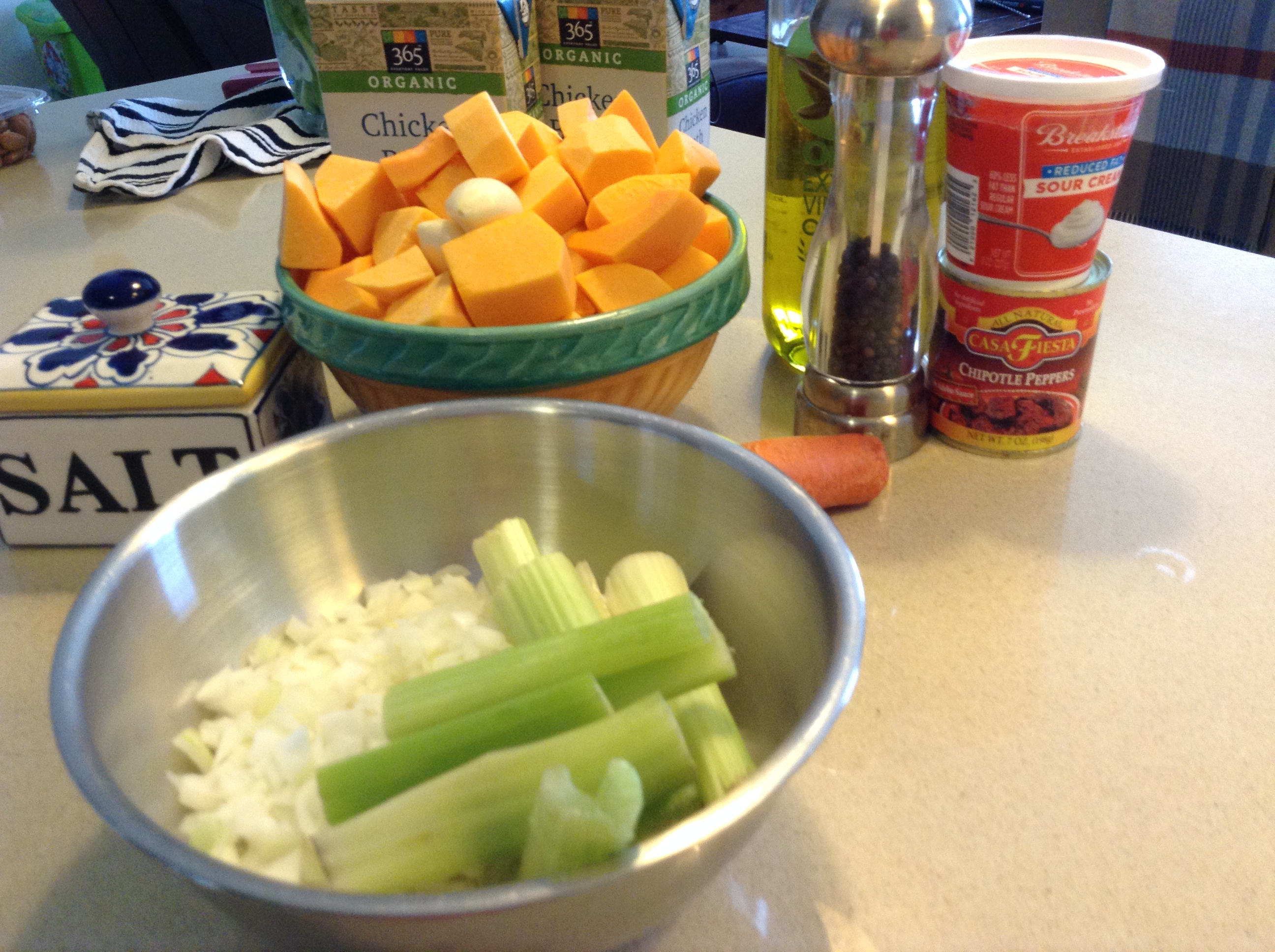 butternut squash , ( I bought 2 packages from Whole Foods of cut up butternut squash it was about 1 lb. each package) canned chipotle in adobo sauce, onion, celery and carrots. Sour Cream if you’d like to add to make topping.