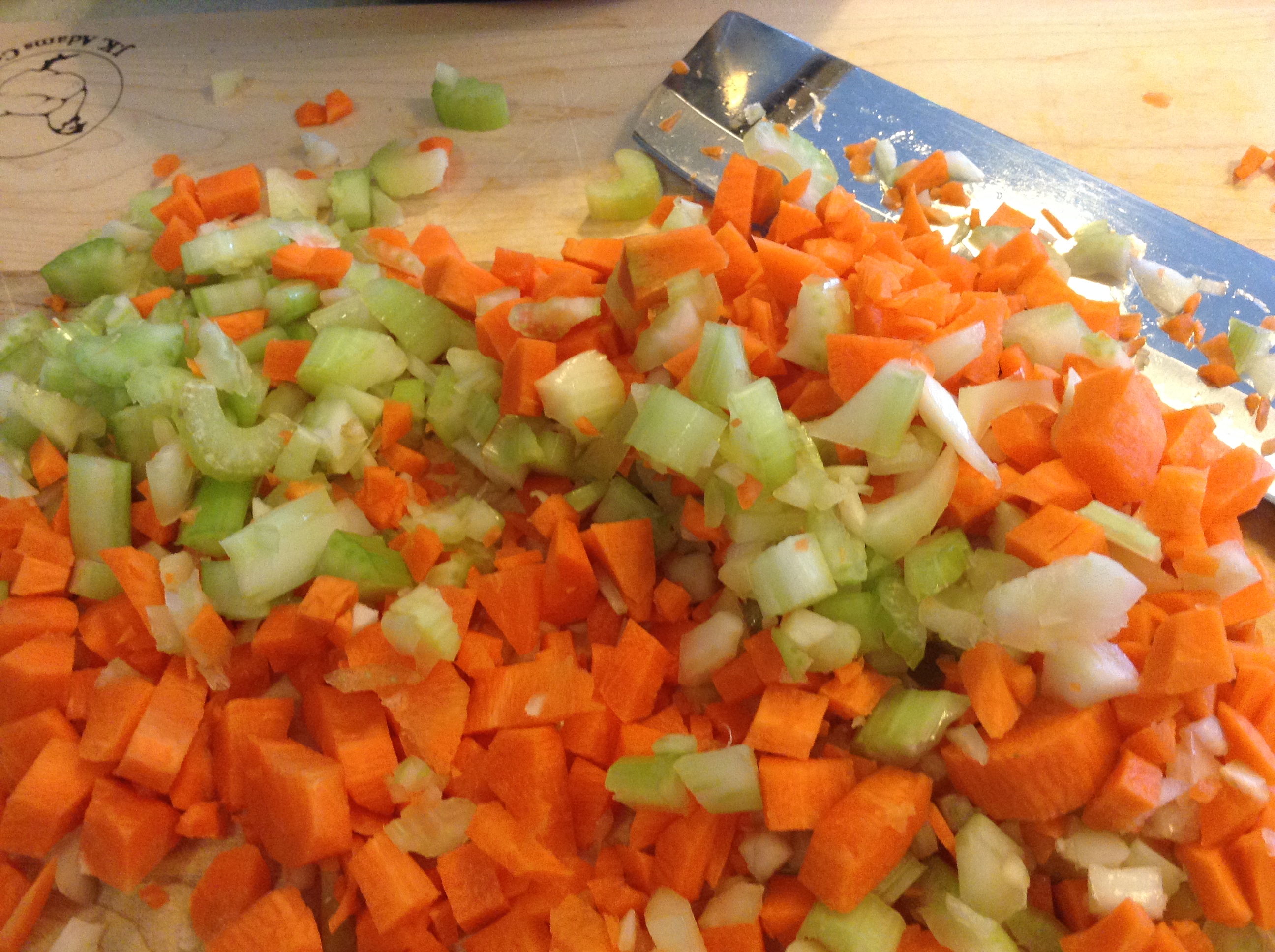In a large heavy pot over medium-high heat add 2 Tablespoons of Olive Oil, heat olive oil and add the basic mirepoix ( carrots, onions and celery) and throw a good pinch of kosher salt in there, you’ll taste for salt later so don’t worry about amount. Saute veggies until tender, about 10 minutes. Add the garlic and sauté for another 2 minutes. Add butternut squash cubes into the pot and stir. Add 4 cups of the chicken broth and bring to a boil. Reduce the heat to low, cover the pot and simmer the veggies are very tender, between 30 and 50 minutes.
