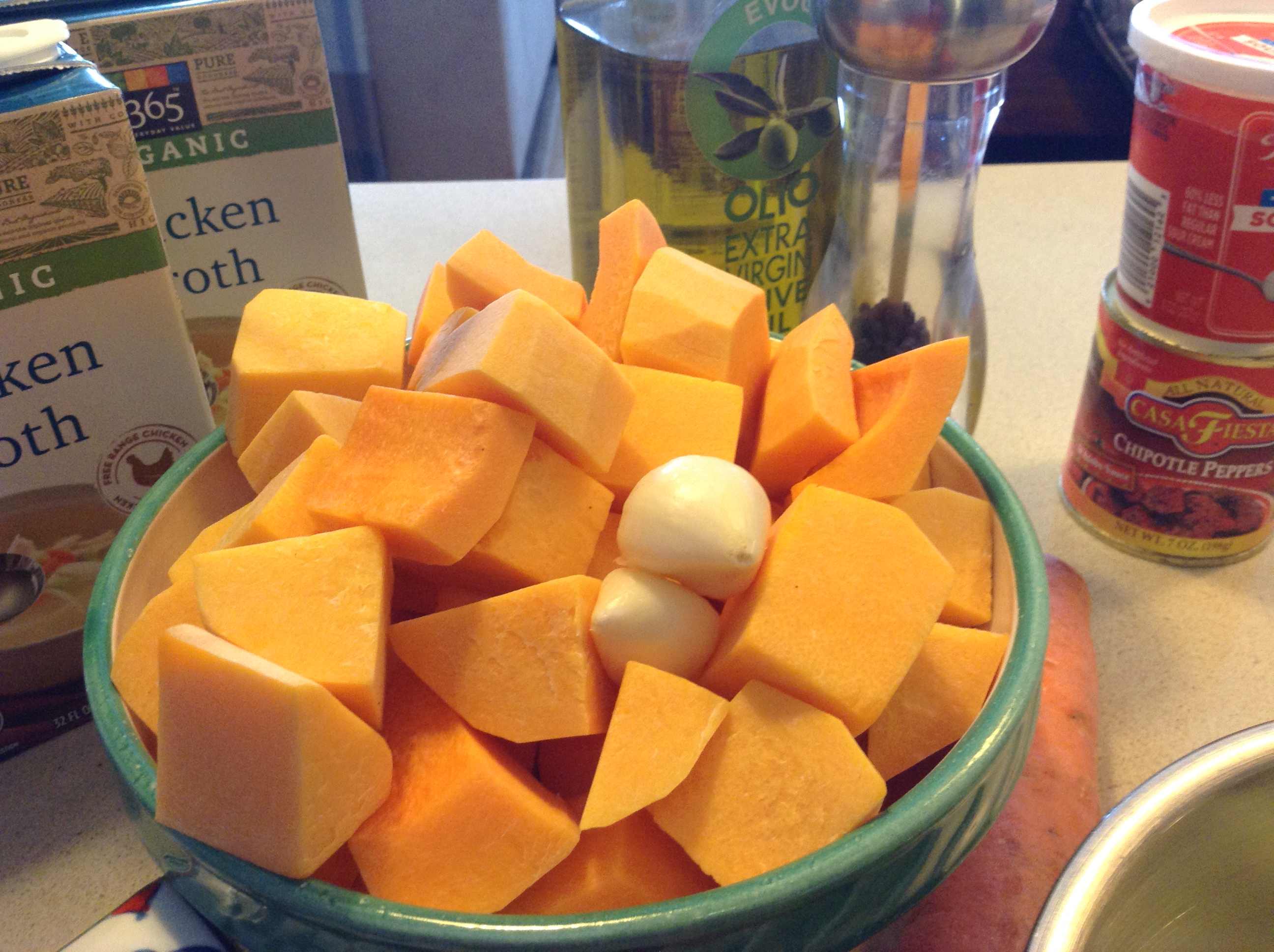 I love my Butternut Squash Soup with no Cream recipe, it is probably one of my most followed postings on my blog and it is by far the easiest most delicious recipe with so few ingredients. I stumbled upon this rendition and thought I’d play around with it and see if it was worth it to mess with a good thing. The soup itself has a few more veggies and garlic and chipotle chiles* in adobo. I love spicy so I wanted to see how this would be. My original recipe is under Creamy Butternut Squash Soup no Cream and it was originally posted on October 18 2011.
