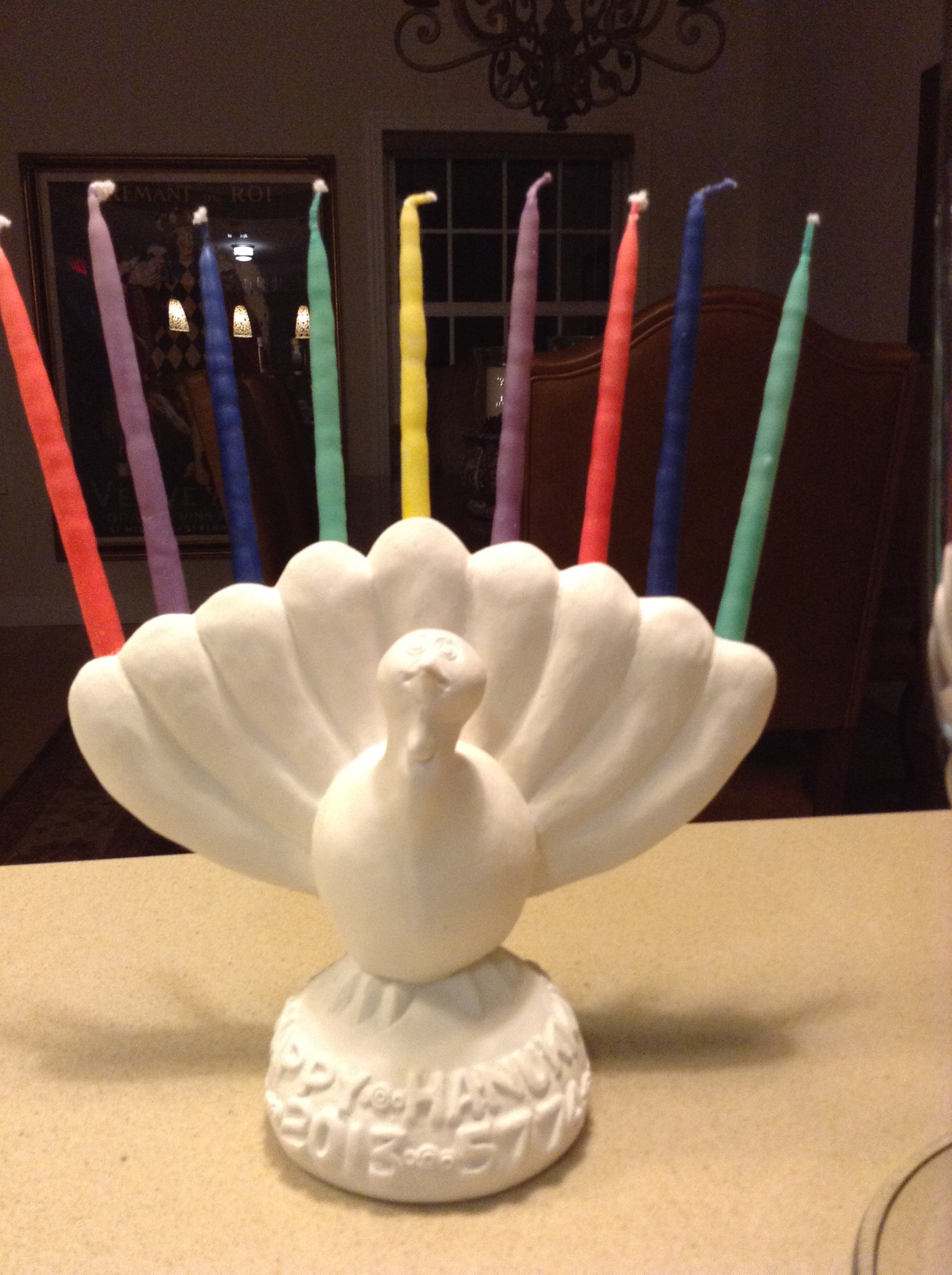 photo (53)This year Thanksgiving ’13 and Chanukah ’13 converge on the same day! Wow what a rare and special treat this is. We can break out the latkes and serve them up with Cranberry Apple Sauce and throw the gelt on the table because this won’t happen again for at least 79,000 more years. Bust out the jelly donuts for dessert and we can light the Menorah with all our guests! That part of it I really like now will I have to get one of those turkey Menorahs? don’t think so. It should be fun to celebrate these 2 totally different holidays on one night. . This is a once in a lifetime phenomenon for sure. I may have to break down and buy one of those turkey menorahs.