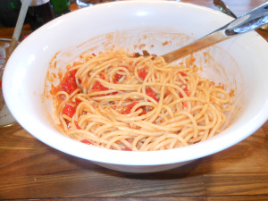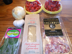Amatrice is a small town in Italy outside of Rome and this dish is named for it. This dish is intended to be made with guanciale , which is a pig jowl and it tastes like a porkier version of bacon or pancetta. I use pancetta, which now comes pre-diced in packages making for a very easy time. I also keep packages of the diced pancetta in my freezer, they defrost very quickly which makes them a perfect dinner ingredient. I also use bucatini pasta which is thick and ropey with a hole like a straw. I wouldn’t wear white while eating this it’s a messy one. Super easy and delicious. I made it tonite with my marinated flank steak. I also used 2 containers of grape tomatoes, but you can easily substitute with 1 large can of San Marzano tomatoes ( crushed )The cherry/grape tomatoes give it a lighter sauce, and I prefer it especially in the summer months.