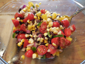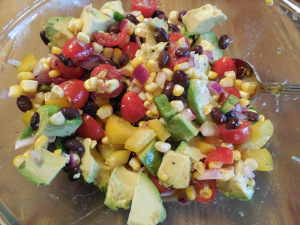 Most perfect summer salad and it is a vegetarian delight. totally vegan. I am not a vegan so I was grilling steaks for dinner and wanted to do a cold salad on the side. I had 2 beautiful ripe avocados on hand and all the ingredients for this yummy salad. I had some fresh corn so I just brought the water to a boil threw it in and when it turned yellow took it out and threw it in a bowl of ice water to stop the cooking. Of course I love jalapenos , use your own discretion and this would be amazing without as well but it was kick ass with them. You can make the salad ahead and let juices meld but don’t add the avocados till you’re ready to serve. You can give them a little squeeze of fresh lime juice so they won’t turn brown so fast. I like to serve salad at room temperature, you just…