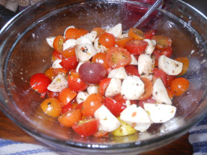 This is one of those recipes that I make that is so super easy. Very few ingredients and other than cutting tomatoes and mozzarella balls, there is very little prep. You gotta love meals like this, especially in the summer when these beautiful heirloom tomatoes are abundant. I really only make this in the summer and it is light and delicious. It makes for a beautiful salad as well and you can serve it at room temperature. I made this tonite since I was tired, and had already bought the bocconcini (mozzarella balls) and chicken. I picked up the heirloom tomatoes today at our new beautiful Whole Foods here in El Jebel. Yeah, welcome Whole Foods to our hood. You’re not going to believe how easy this is.
