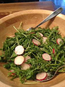 Beautiful radishes at the Farmer’s Market and beautiful arugula from local farms. I made this salad from radishes and arugula with Parmesan cheese, olive oil and lemons. This is light and our friends loved it, so here it is. Whenever I make something new I need honest opinions and I got them from our friends because you know by now that Joel wouldn’t like it , since there was parmesan cheese he did take a bite but definitely not his thing. It is so my thing though and thanks Bob and Michele for your honest opinions.