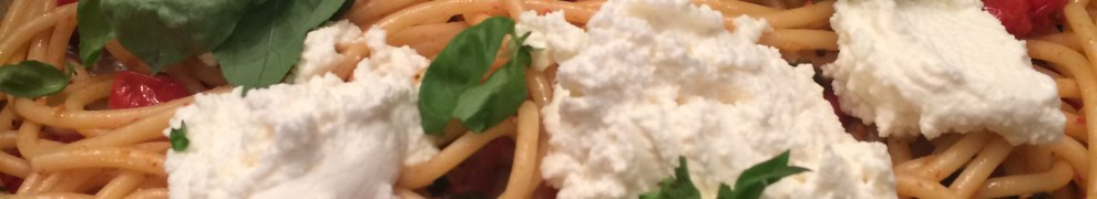 Once the pasta is cooked al dente, drain it in a colander, no need to rinse cooked pasta. Then add it to the pot with the tomatoes. I added ricotta cheese right before we were going to eat and mixed well with the rest of the basil leaves and taste for more salt and pepper.