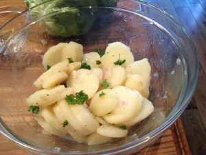 Every year on August 15 Julia Child comes to mind since it is her birthday and would have been 101st Birthday. She was such a huge influence on all of us who cook and enjoy eating so I try and make one or two of her recipes every year on this day. This is a most delicious light “very French” potato salad. I am not a huge fan of potatoes swimming in mayonnaise so this was such a welcome treat. It is moderately difficult and that just means there are a few steps involved. It’s worth the effort, her cooking was never effortless but well worth it.