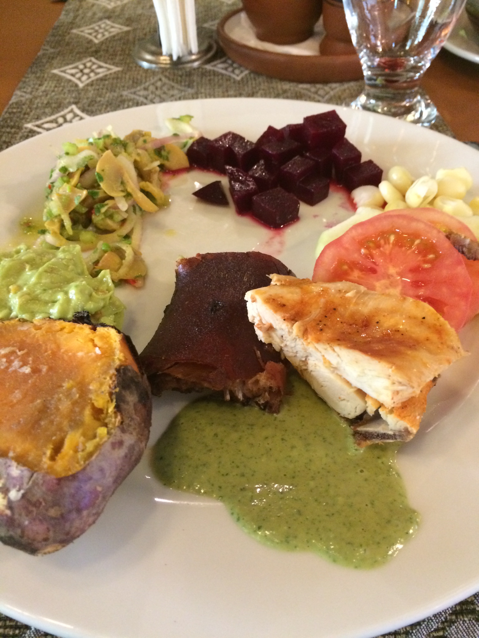Just got home from the most amazing vacation to Peru and The Galapagos Islands in Ecuador. We trekked in Peru, saw Macchu Picchu, stayed at amazing places and ate amazing Peruvian and Ecuadorian Food. Some days during our trek we ate lunch in tents set up for dining and food cooked by local cooks, everything brought up there by mules! It was just delicious. There are some pictures of me at a farmers market in Peru before we started our trek and some amazing pictures of some wonderful dishes we ate in a most beautiful Hacienda that we stayed in outside of Quito, Ecuador after our trek to Macchu Picchu. It was located in a town called Zuleta and named the Hacienda Zuleta. It was a piece of heaven on earth. The most amazing thing about the food served in the Hacienda was that they had their own organic garden on their property and all vegetables, quinoa and fruits were from there. They have 4,000 varieties of potatoes! and the most delicious tree tomatoes which grow on a tree and are much more like a fruit than a regular tomato which grows in the ground. Plus there was delicious locally caught trout and local shrimp. The food was “home cooked” which meant that there was no chef just men and women from the local area who cook for the Hacienda and apply their knowledge of local cuisine and locally grown and raised food.