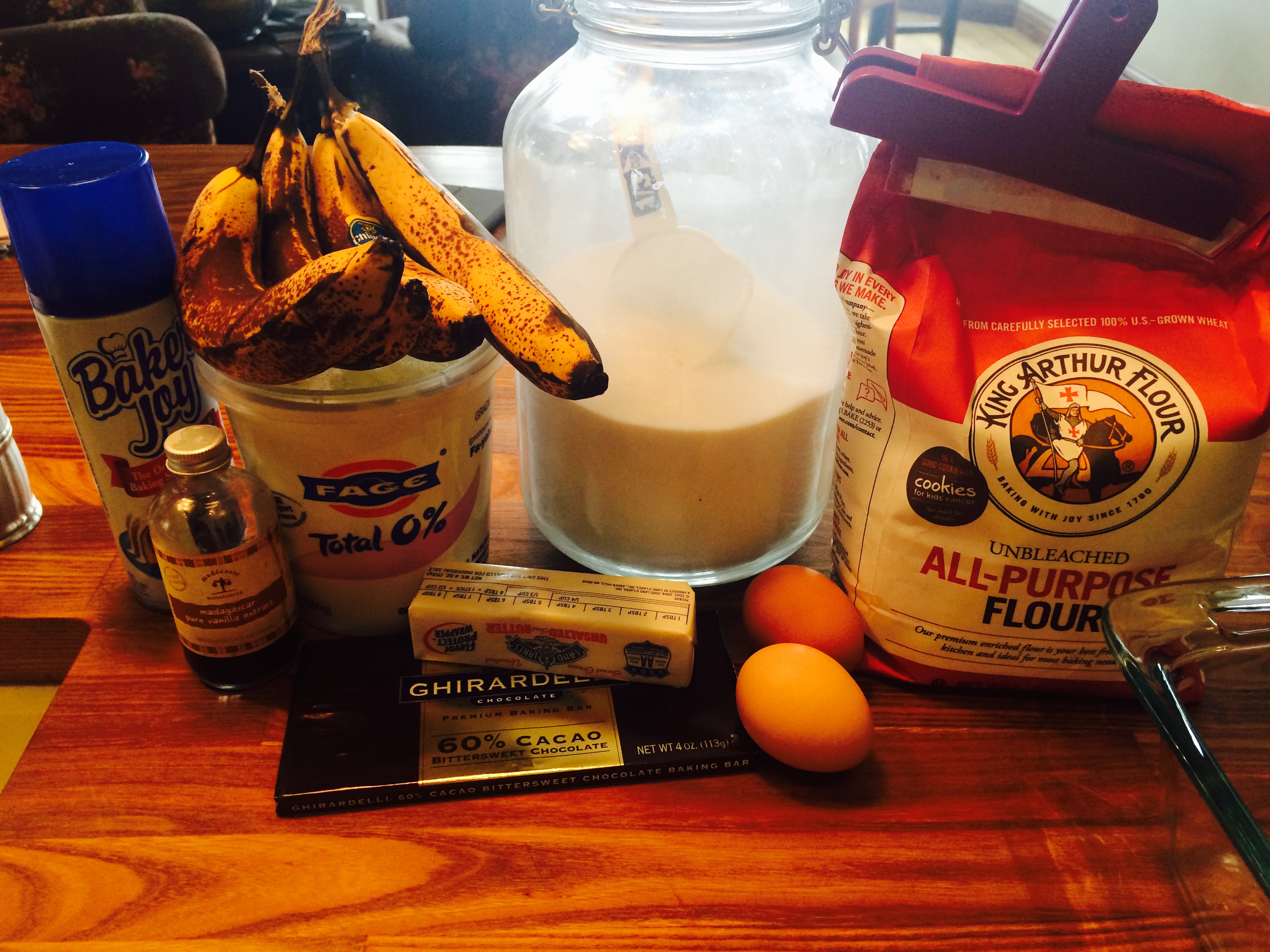 Beat in mashed bananas, yogurt, and vanilla. Beat in dry ingredients and chocolate on medium speed. Pour batter into prepared baking pan. Bake until a cake tester inserted into the center of loaf comes out clean, app. 50 – 60 minutes. I baked mine for about one hour.