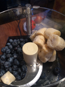 Let’s think dessert and let’s think “light” dessert. This is so delicious and even has a creamy consistency just like ice cream. No dairy , just fruit and a food processor. This is a great one for the kids. Use whatever fruits you prefer. I used Bananas and Blueberries this time. Also check out the Banana Not Ice Cream Ice Cream Recipe on my site. I know you will enjoy this one.