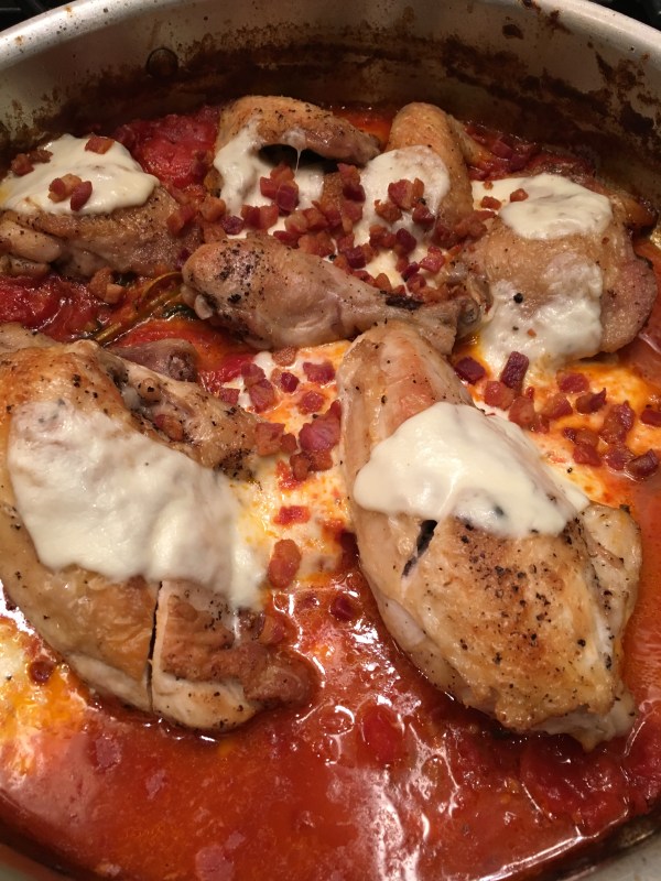Skillet Chicken–made with Tomatoes, Pancetta and Mozzarella