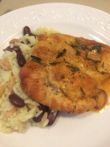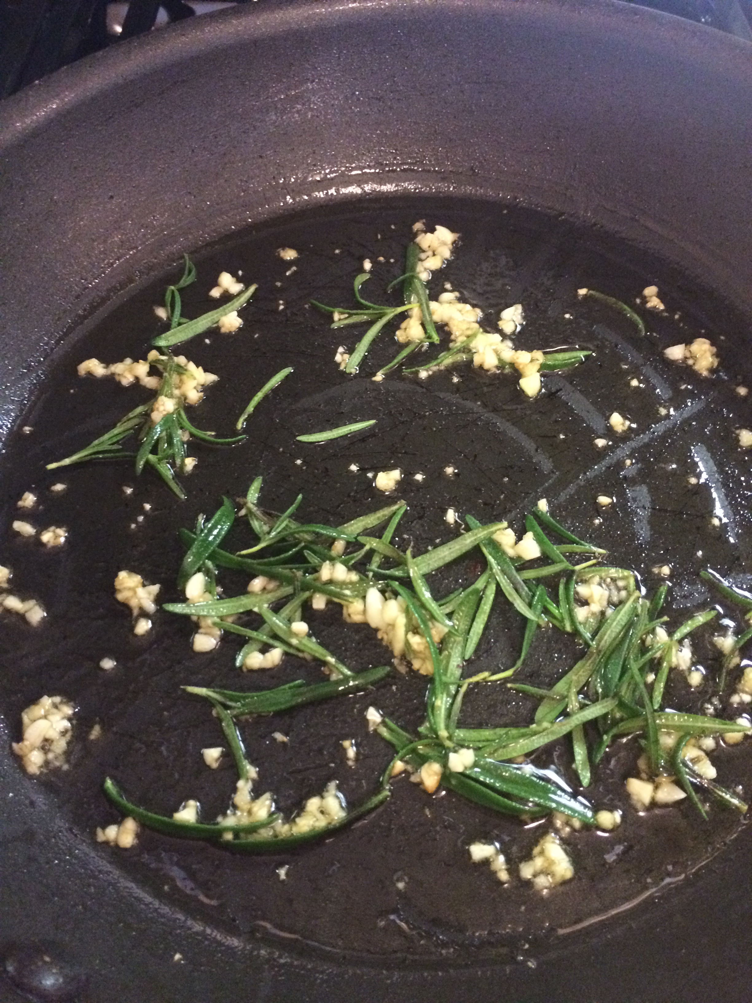 I actually wiped the skillet clean and started with another tablespoon of oil for the sauce. I found the skillet cleaner this way. When pan cooled down a little bit I wiped it dry with a clean paper towel. Then proceed with the next step. Add in the garlic, stirring until golden brown, 1 – 2 minutes. Stir in the rosemary and let cook for about a minute. Now add the orange juice and broth. Let simmer and stir up all the brown bits that may be stuck to the bottom of the pan. Simmer until the sauce starts to thicken a bit, about 5 minutes. Taste for salt, I added a little bit.