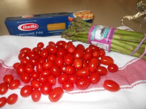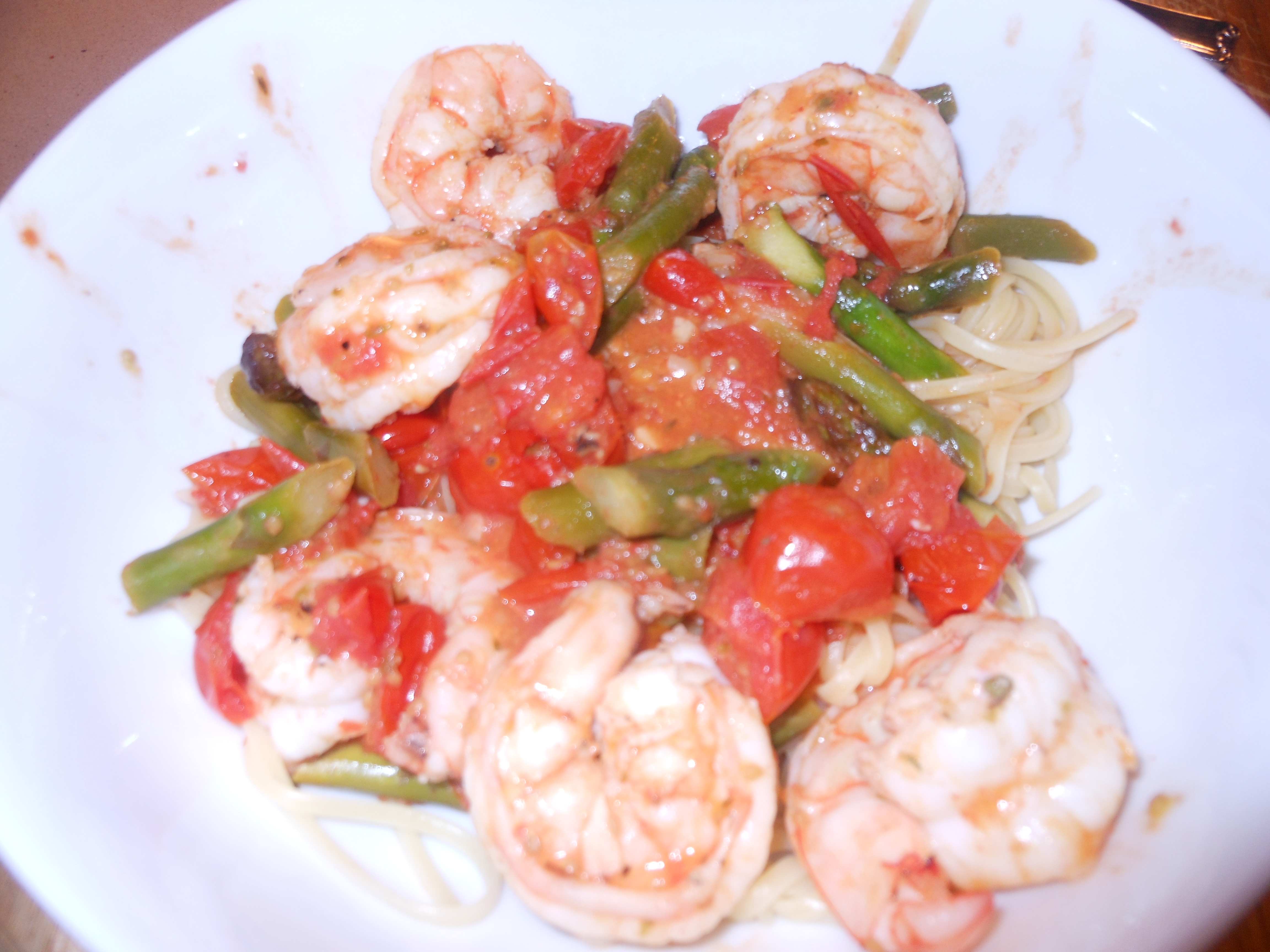 It is really Springtime now and it just makes you want to lighten up the menu a bit, and my mind immediately goes to asparagus! This recipe is a variation on my Summertime Tomato Pasta. I wanted to use some of those beautiful asparagus out there. Even though I knew Joel would pick them out , I still made this dish. The asparagus are large enough for him to easily pick out and put on my plate. This dish is light and delicious and pretty quick to prepare. It is like springtime in a bowl! There are so very many things to do with asparagus but this just appealed to me tonite and if you leave the shrimp out you have a lovely vegetarian pasta dish. I used the shrimp. I also used linguine in this , it just seems to hold on to the flavors nicely. Happy Spring and Enjoy. This recipe was inspired by Giada de Laurentis .