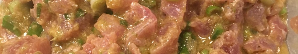 Also a little note after researching the topic of Tuna. The original recipe says to mix well so I did, but if you mix well with the fish in it you cause a lot of air to get into the fish and the fish will turn a browner color. It is just oxygenation of the fish and it is not harmful. So I recommend mixing the sauce well first and then add to the fish and stir gently and cover with plastic wrap and refrigerate for at least an hour to allow flavors to marinate. The change in color is not harmful as long as you are starting out with very fresh tuna . I used a box of sushi grade frozen tuna available in my Whole Foods Market. You can purchase from your local fish store as well. The frozen one was very easy to work with but comes in very small blocks. (see picture) and is rather pricey.