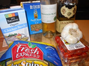 Turn heat down to low, add garlic and give it a quick stir, be careful not to burn garlic. Pour in wine and broth, stirring to deglaze the pan, raise the heat and allow the liquid to come to a boil. Allow the liquid to boil for a bit, I let it boil for about 5 minutes, reduce the cooking liquid by at least half. I then reduce to a simmer and add the tomatoes, I let them cook for about 5 minutes till they start to release their liquid a bit, and just start to soften. I also add Salt and Pepper again here, then I add chicken to pan . stir it around, add the bag of spinach it will start to wilt as you toss everything , then add the drained pasta, mix well and serve. So light and delicious.