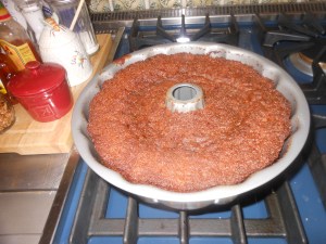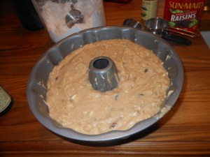 I always call my friend Susan the Queen of the Bundt Cake. It certainly seems to be her calling as she is always coming up with new and delicious Bundt Cakes for all of us to try. I changed one of the ingredients because I bought chunky applesauce instead of plain applesauce. Of course, if you’re so inclined you can make your own applesauce (I wasn’t so inclined today!). The original recipe hails from The Silver Palate, and I have to say this is one cookbook you don’t want to be without. There are so very many wonderful recipes in it. I hoped it came out as good as Susan’s cake did because hers was delicious. It has a slightly spicy flavoring, and is just so darn good. Am very happy to report that this cake came out awesome! Super Delicious with the chunky applesauce. Very moist and delicious, cooked perfectly at 1 hour and 10 minutes. Thanks Suki and the Silver Palate!
