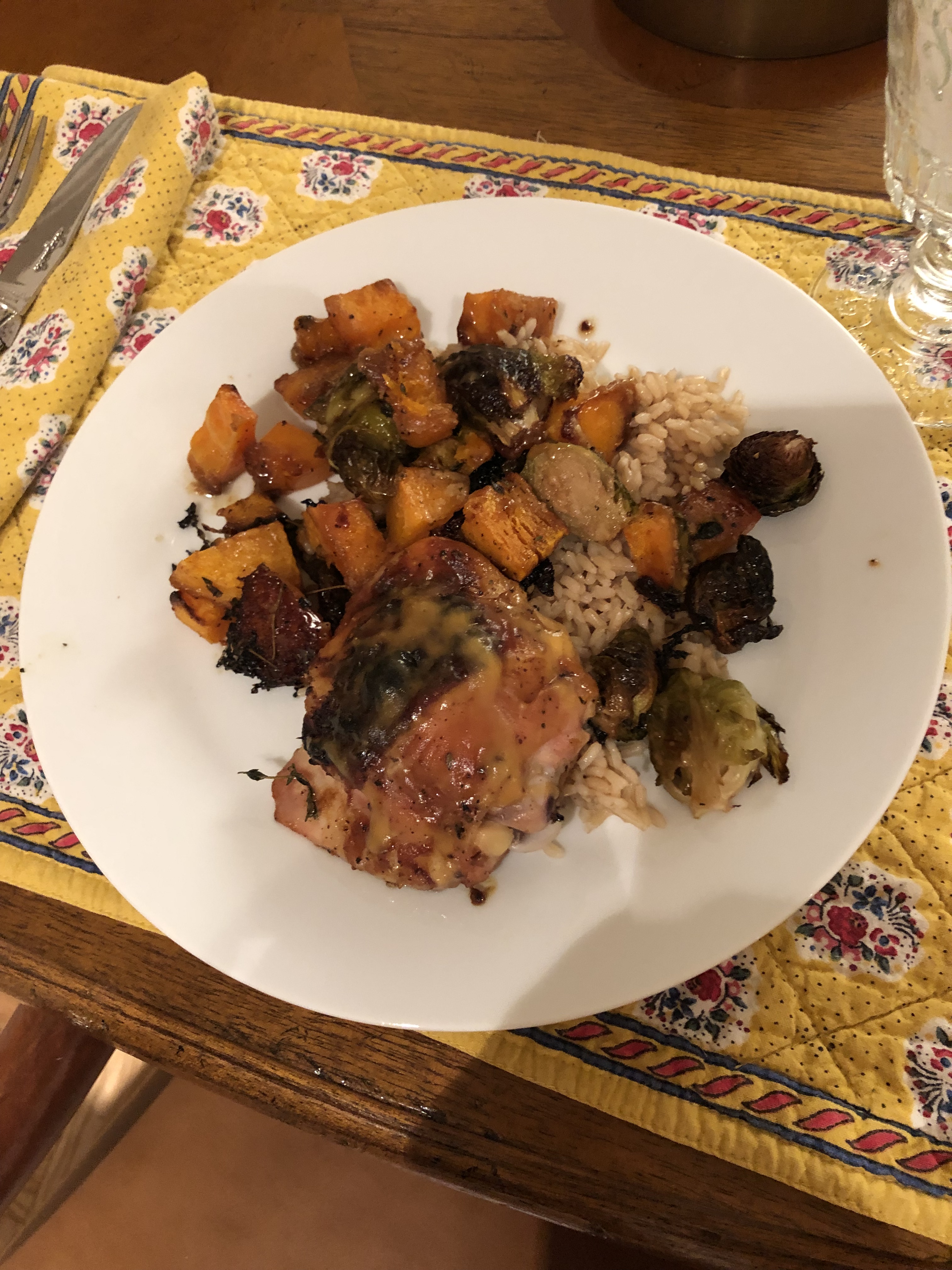 Maple – Dijon Chicken with Brussels Sprouts and Butternut Squash.