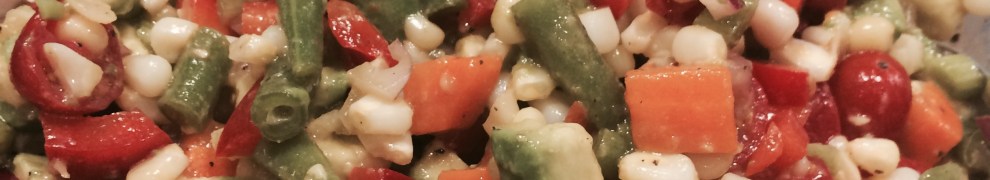 When water comes to a boil, add cut up green beans and carrots to boiling water and cook until tender, about 5-6 minutes. Add corn and cook a couple of minutes more. Drain in a colander and rinse under cold water, let veggies completely cool down. I let them sit till they were completely cool. Give vinaigrette a quick whisk, and add veggies to the bowl. Add in the tomatoes, celery , bell pepper and onion and toss well. Set aside and let marinate for at least 1/2 hour. I probably let it sit in marinade for about an hour.