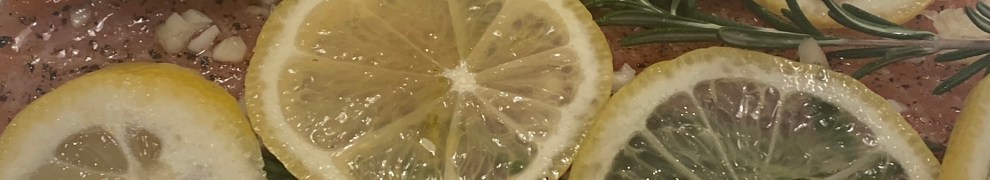 Drizzle the Salmon with the olive oil and sprinkle with the salt and pepper. Rub to coat, then add the chopped garlic cloves on top. Place the remaining 3 sprigs of Rosemary and lemon slices on top of the salmon. Juice the second lemon and pour the juice over the top.