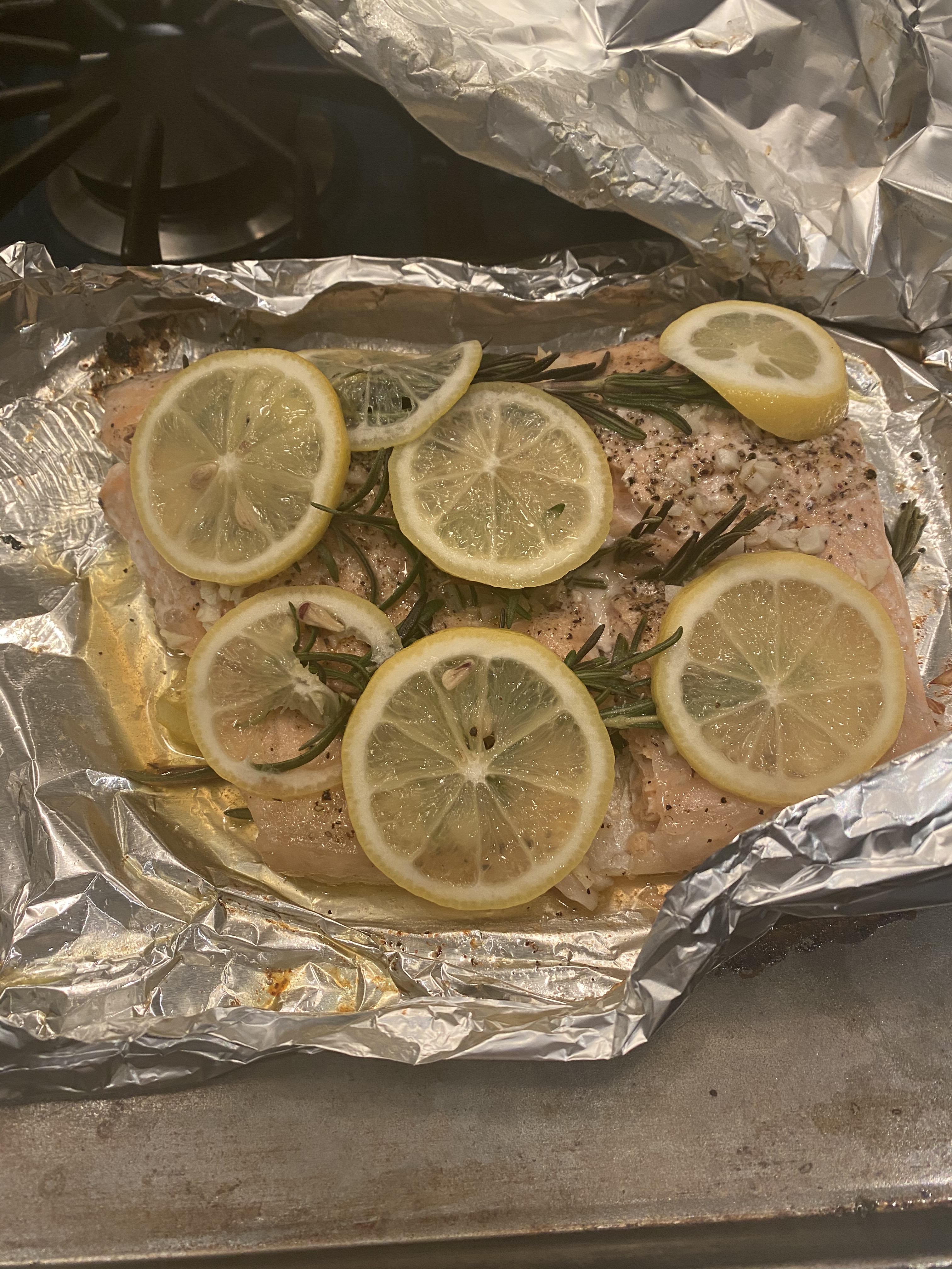 Lightly coat the aluminum foil with baking spray, then arrange 2 sprigs of Rosemary down the middle. Cut one of the lemons into thin slices and place 1/2 the slices down the middle with the rosemary. Place the Salmon on top.