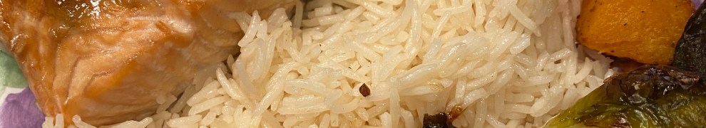 Place marinated Salmon in the open center space of pan. Pour any leftover marinade over the salmon. Bake at 400 degrees for at least 15 minutes and check salmon doneness — I cooked for 20 minutes. Remove from oven and top Salmon with the green onion. I served with Basmati Rice and Brussels and Butternut.
