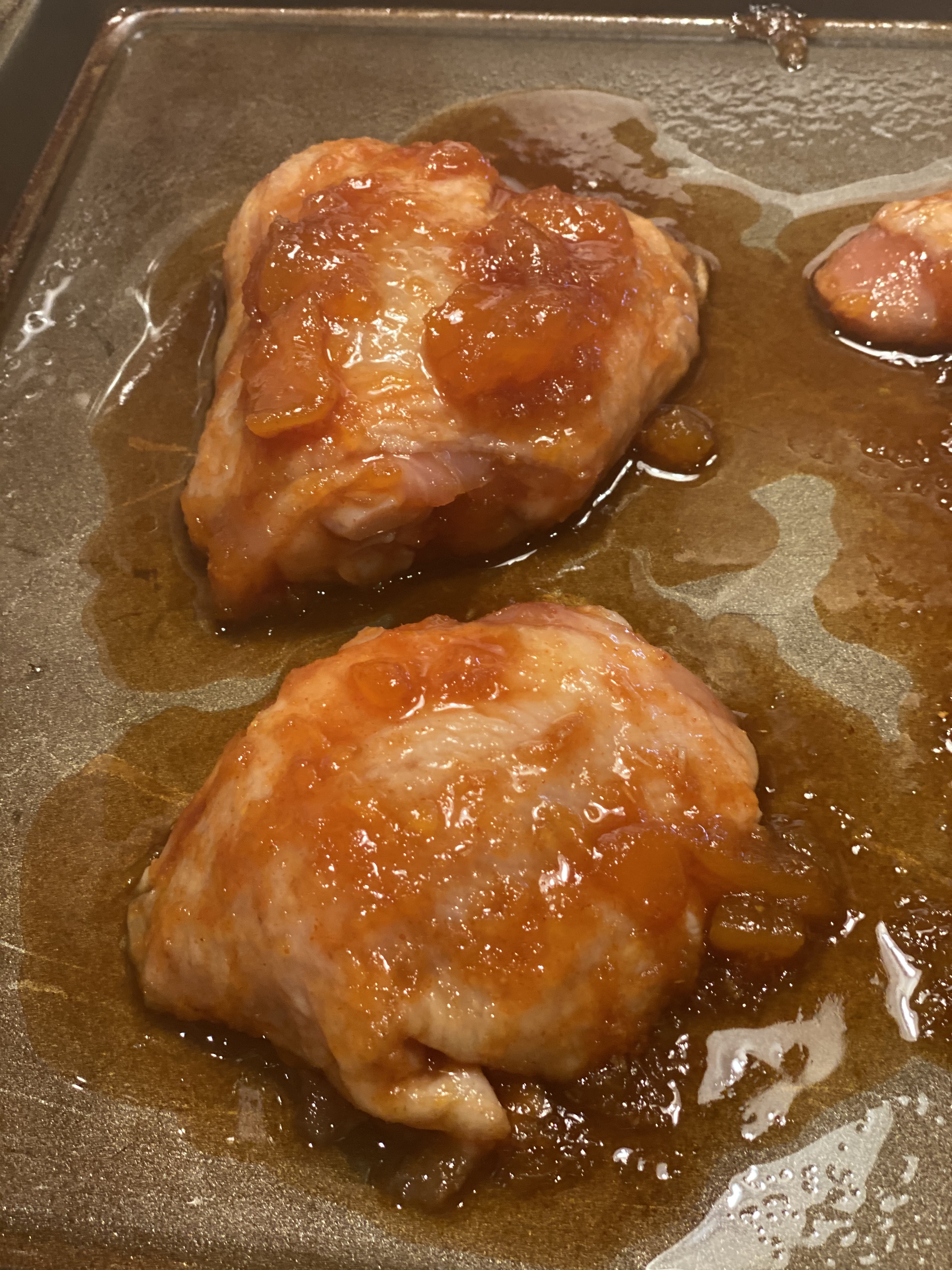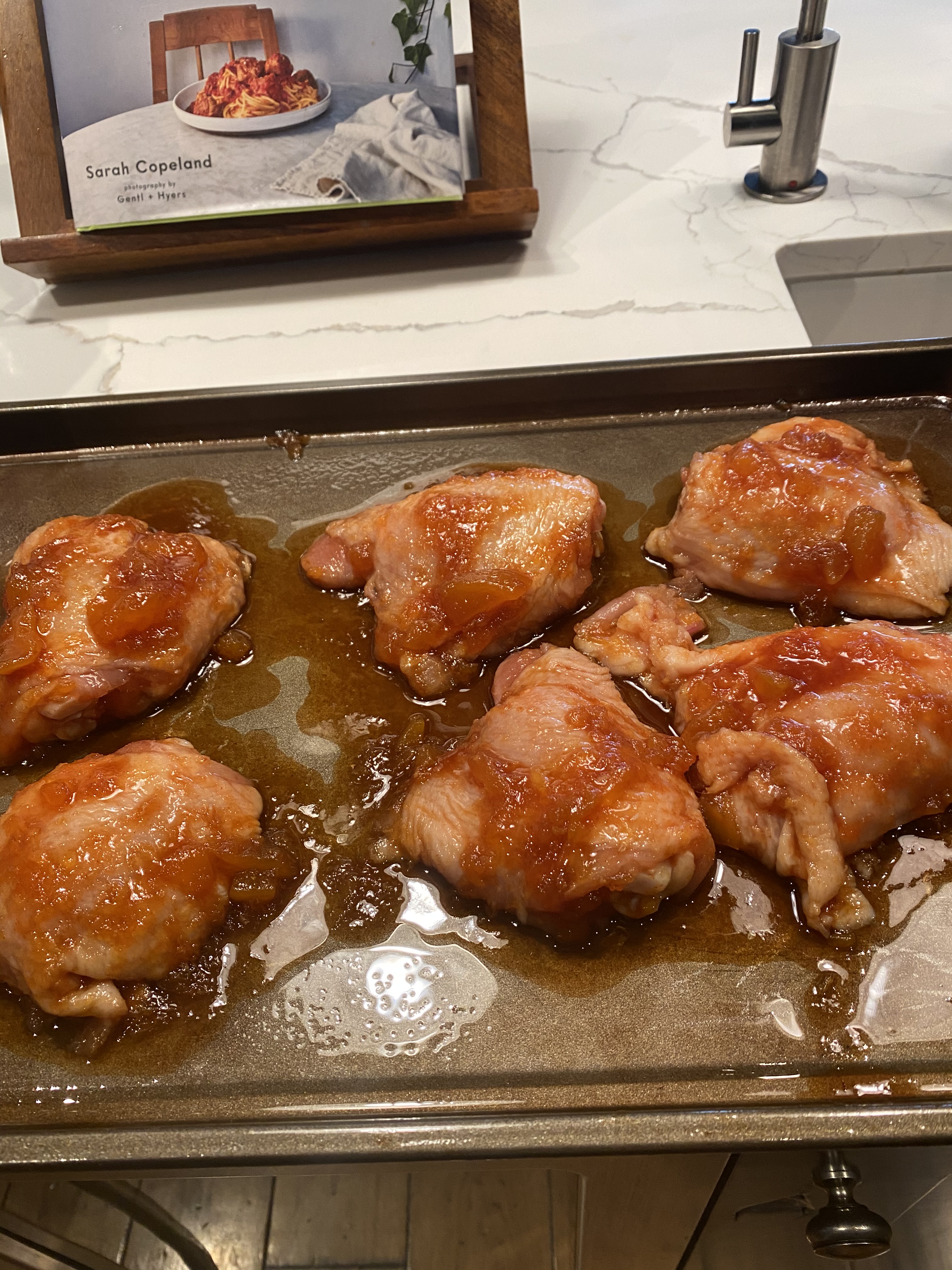 Arrange the chicken on rimmed baking sheet or a large baking dish and pour any remaining sauce over the chicken pieces. I also added a little water (1/4 cup) to sauce in pan