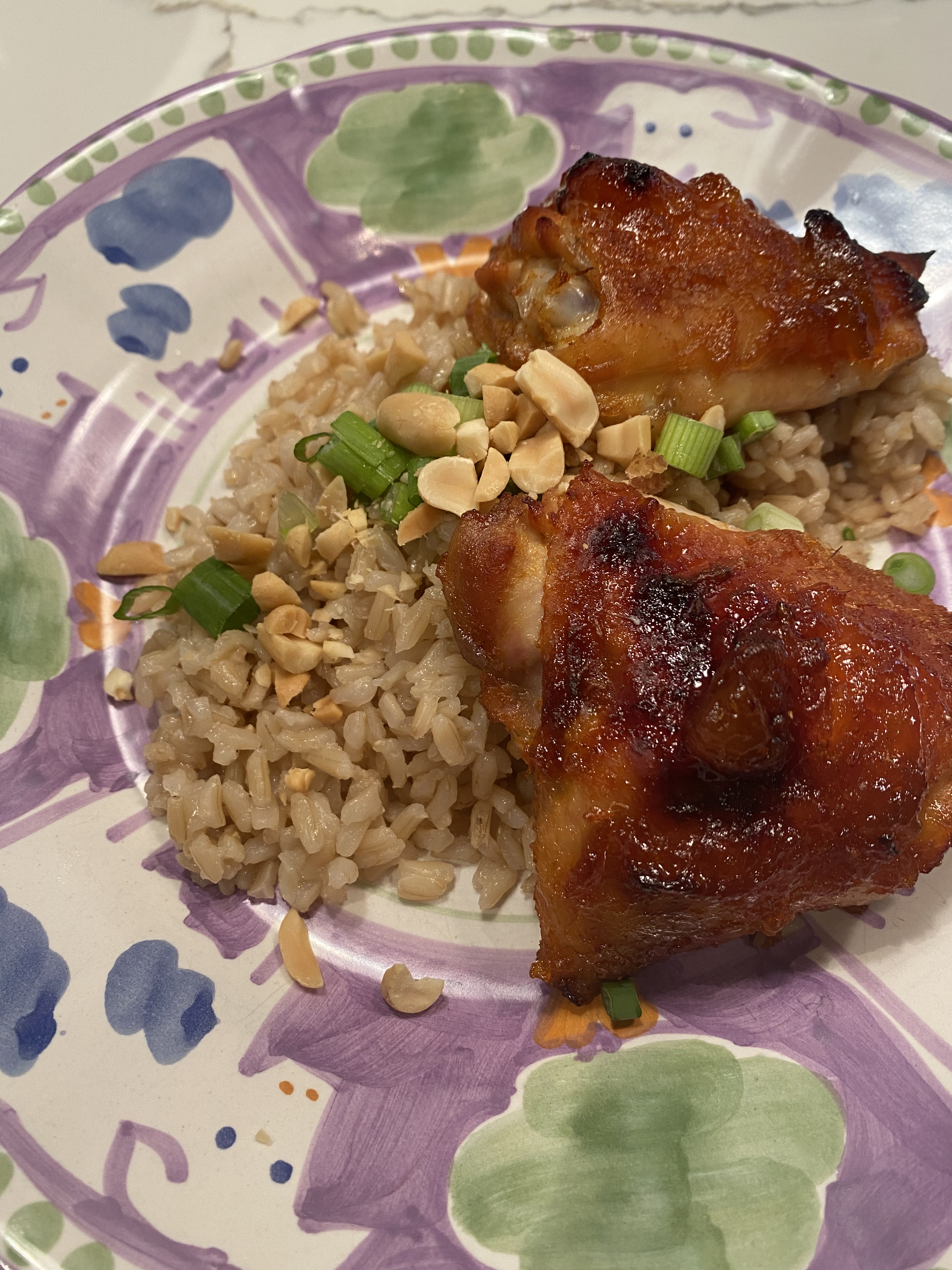 Cook the coconut rice if you’d like or any other kind of rice . Plate up the chicken over the rice and spoon any sauce over the chicken. Sprinkle with the scallions and chopped peanuts if you’d like and Enjoy!