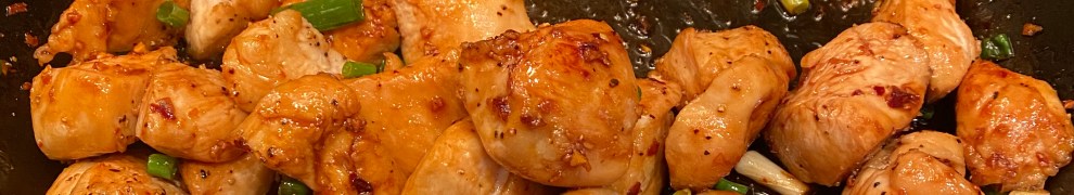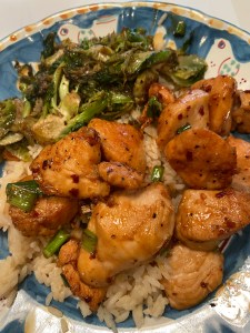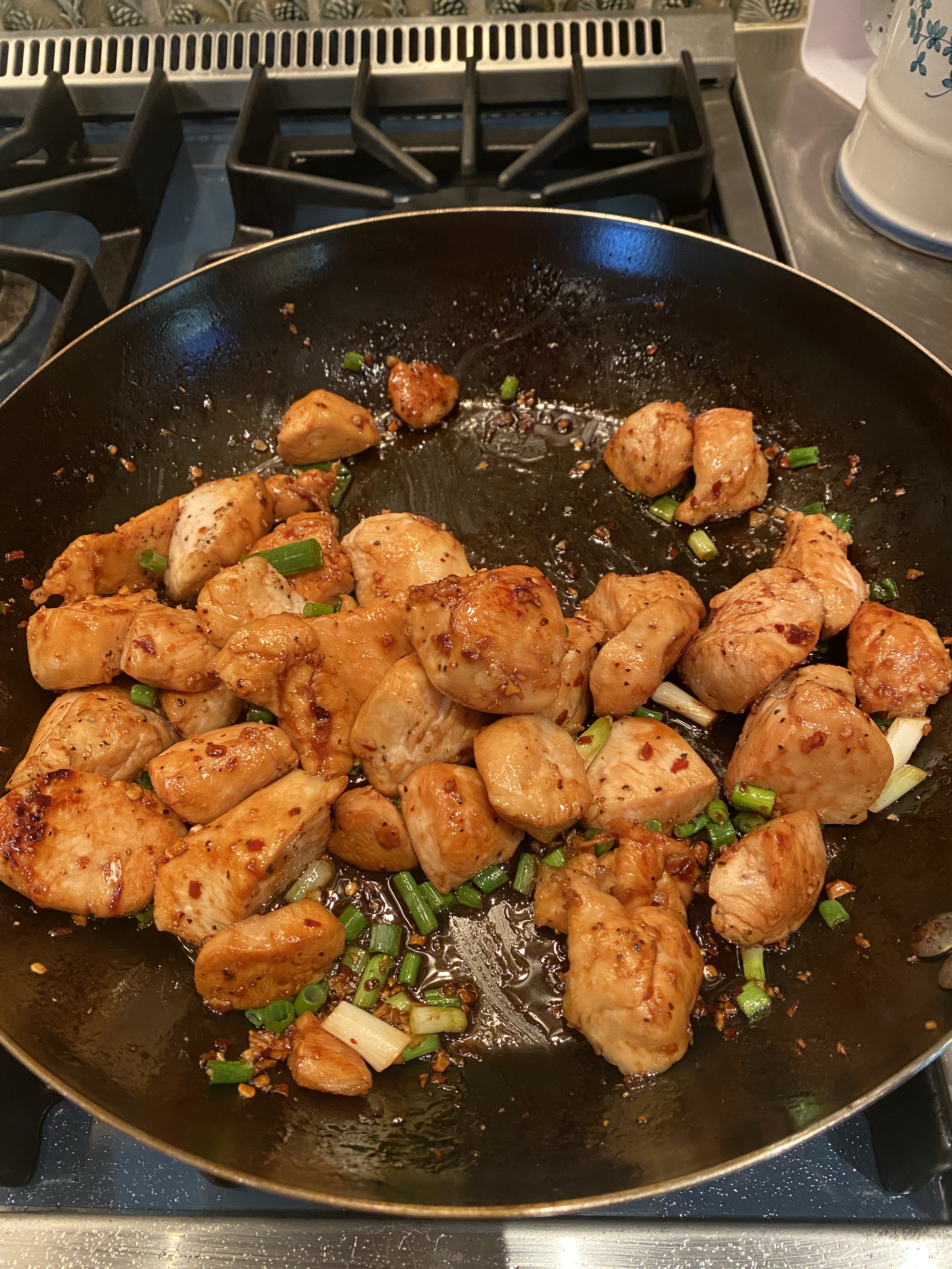 After the initial 4 minutes with a spatula I moved chicken around and added the sauce to the pan and tossed to coat the chicken pieces. I cooked another 4-5 minutes until chicken looked cooked through but not over-cooked. I threw in the cut up scallions and plated it up over the rice . ( see pics)