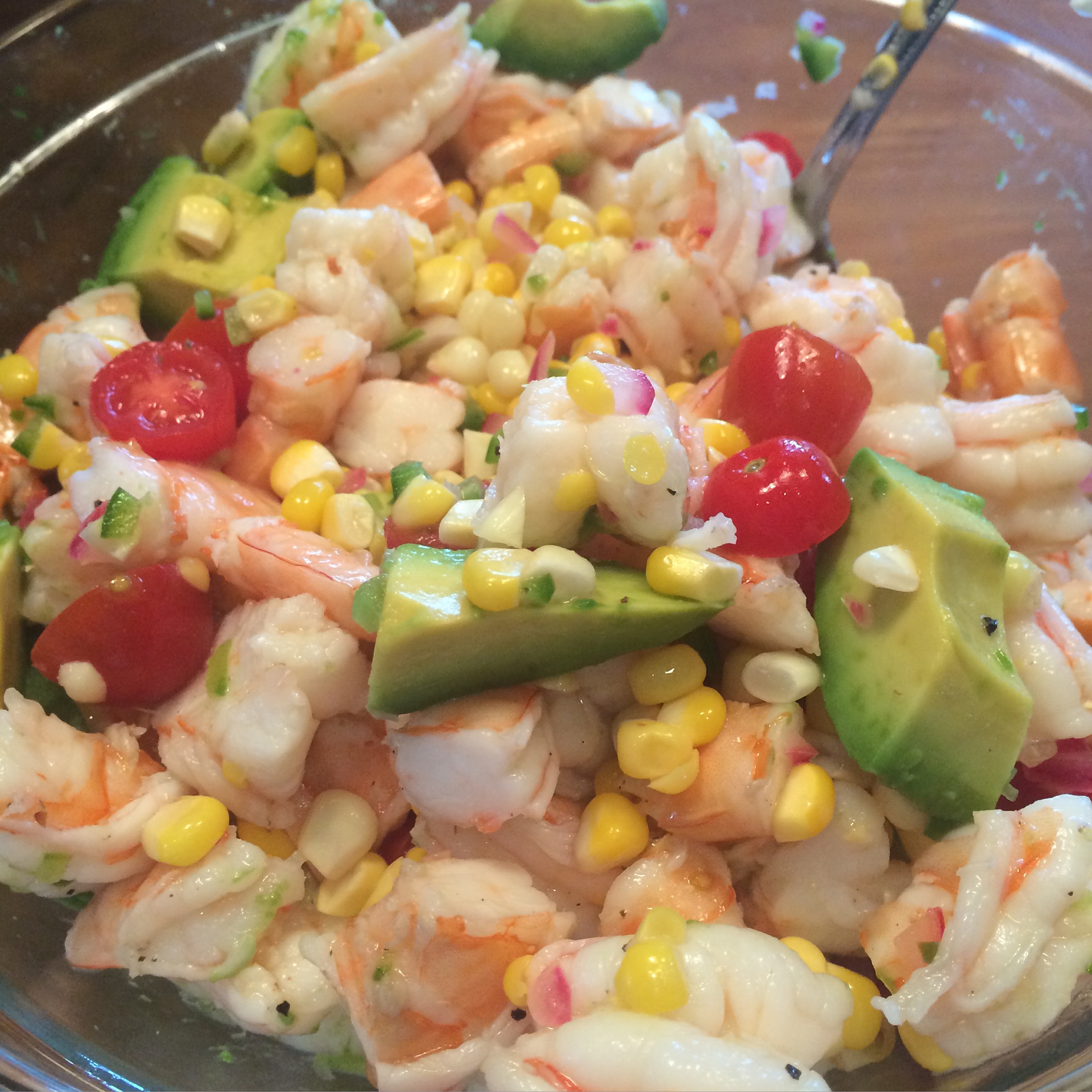 I placed Shrimp, Corn, Jalapeno and Tomatoes into a large bowl. About an hour prior to serving I poured the lime juice combination over the bowl of Shrimp.