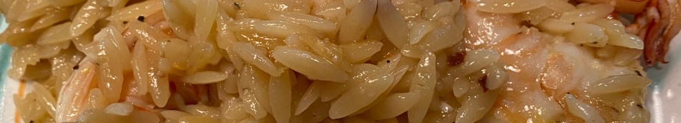 In a medium skillet sprayed with cooking spray, add the butter, the remaining oil and garlic and heat over low to medium heat. Don’t burn the garlic. When the butter starts to bubble, add the orzo and another 1/2 teaspoon kosher salt and cook by stirring around the pan as often as possible, toast the orzo in pan for about 2 minutes, adjusting the heat so as not to burn the orzo or the garlic. Carefully add the wine to the pan and stir in until it is absorbed for another minute or so. Stir in the chicken stock , reduce heat to low, cover and cook until the orzo is al dente, probably another 12- 15 minutes. This would be a good time to taste for salt and pepper .