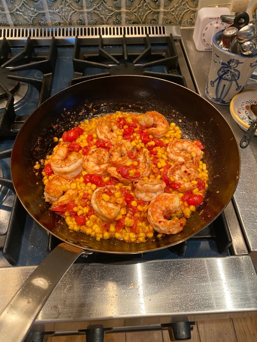 I saw this recipe on the New York Times cooking site by Ali Slagle. One of my most favorite cooking sites . I made a few changes to recipe and would highly recommend checking out this recipe. I served with rice but this recipe stands on it’s own as a meal. You can use pasta or bread as well. If you love shrimp and corn and tomatoes this one’s for you.
