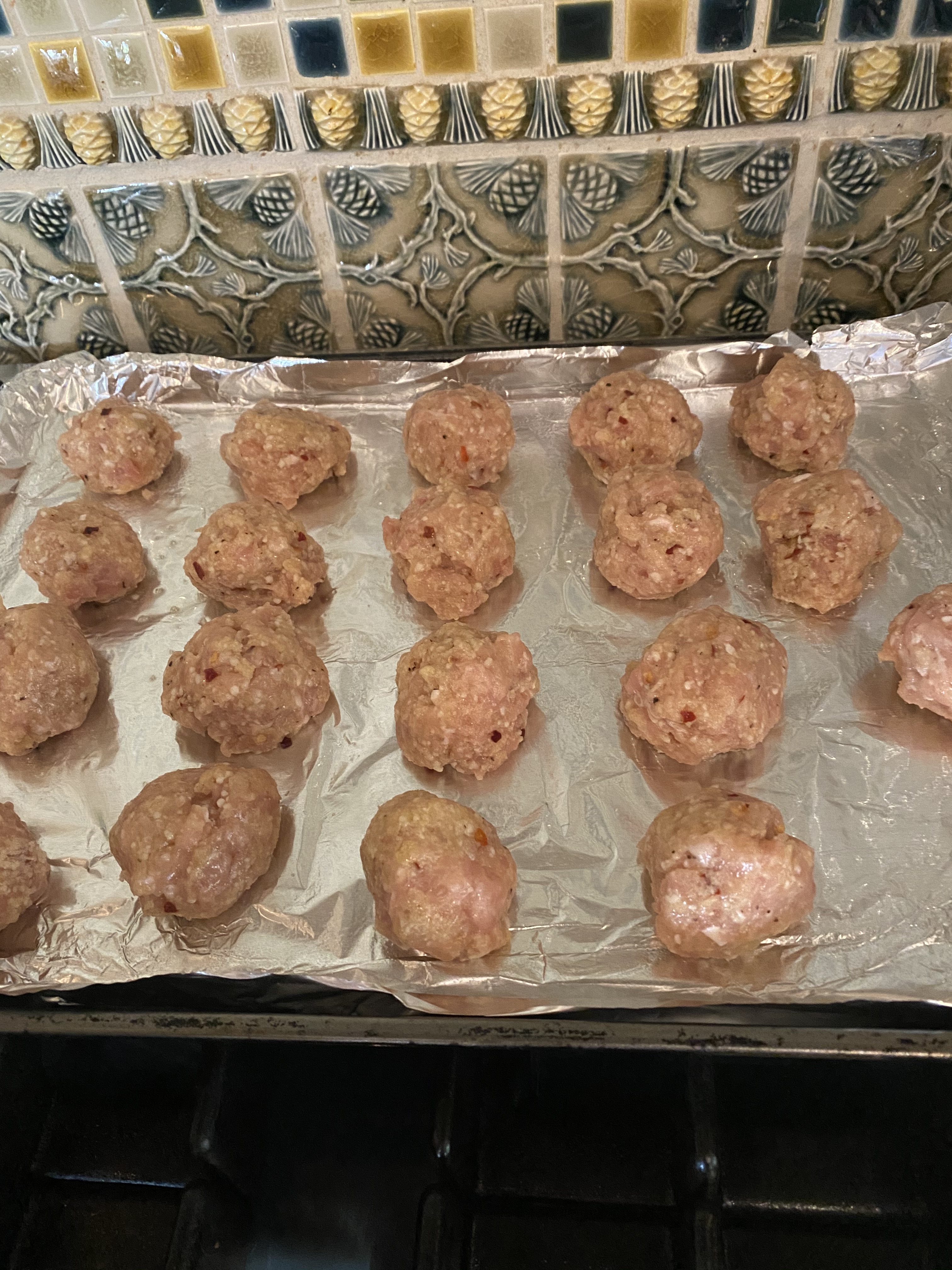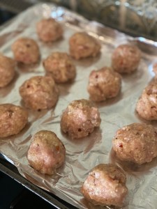 Roll the meat into smallish balls — not too small — I get anywhere between 18-25 meat balls out of this. Line them up on your baking sheet and bake for app. 20-30 minutes.